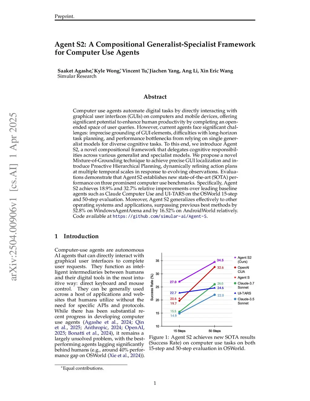 Computer use agents automate digital tasks by directly interacting with graphical user interfaces (GUIs) on computers and mobile devices, offering significant potential to enhance human productivity by completing an open-ended space of user queries. However, current agents face significant challenges: imprecise grounding of GUI elements, difficulties with long-horizon task planning, and performance bottlenecks from relying on single generalist models for diverse cognitive tasks. To this end, we introduce Agent S2, a novel compositional framework that delegates cognitive responsibilities across various generalist and specialist models. We propose a novel Mixture-of-Grounding technique to achieve precise GUI localization and introduce Proactive Hierarchical Planning, dynamically refining action plans at multiple temporal scales in response to evolving observations. Evaluations demonstrate that Agent S2 establishes new state-of-the-art (SOTA) performance on three prominent computer use benchmarks. Specifically, Agent S2 achieves 18.9% and 32.7% relative improvements over leading baseline agents such as Claude Computer Use and UI-TARS on the OSWorld 15-step and 50-step evaluation. Moreover, Agent S2 generalizes effectively to other operating systems and applications, surpassing previous best methods by 52.8% on WindowsAgentArena and by 16.52% on AndroidWorld relatively. Code available atthis https URL.