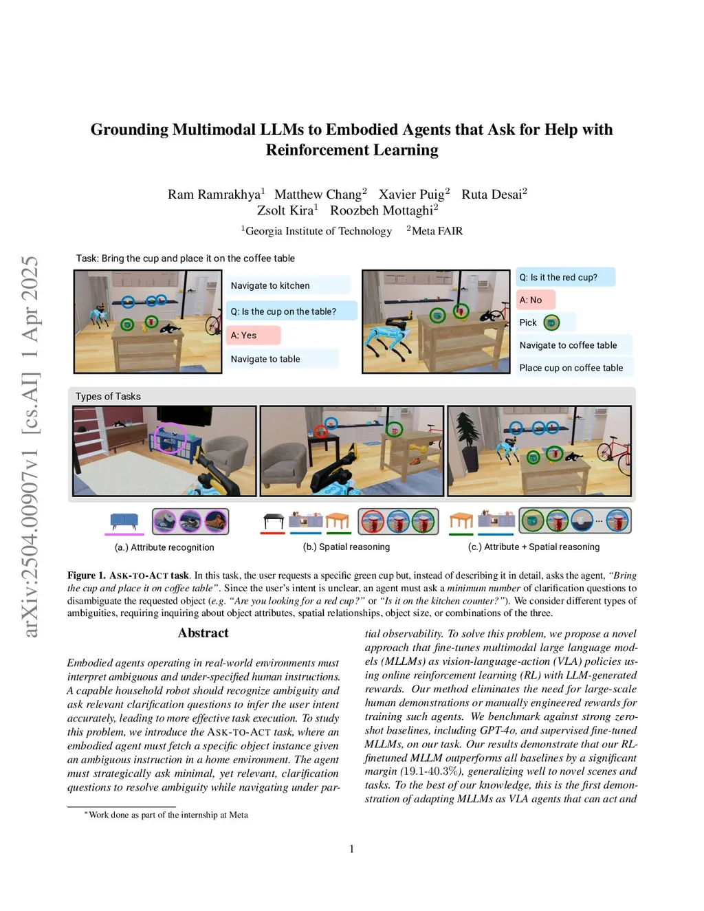 Embodied agents operating in household environments must interpret ambiguous and under-specified human instructions. A capable household robot should recognize ambiguity and ask relevant clarification questions to infer the user intent accurately, leading to more effective task execution. To study this problem, we introduce the Ask-to-Act task, where an embodied agent is tasked with a single or multi-object rearrangement task using an under-specified instruction in a home environment. The agent must strategically ask minimal, yet relevant, clarification questions to resolve ambiguity while navigating under partial observability. To address this challenge, we propose a novel approach that fine-tunes multi-modal large language models (MLLMs) as vision-language-action (VLA) policies using online reinforcement learning (RL) with LLM-generated rewards. Our method eliminates the need for large-scale human demonstrations or manually engineered rewards for training such agents. We benchmark against strong zero-shot baselines including GPT-4o as well as supervised fine-tuned MLLMs on our task. Our results show that our RL-finetuned MLLM outperforms all baselines by a significant margin (10.4-16.5%), generalizing well to novel scenes and tasks. To the best of our knowledge, this is the first demonstration of adapting MLLMs as VLA agents that can act and ask for help using LLM-generated rewards with online RL.