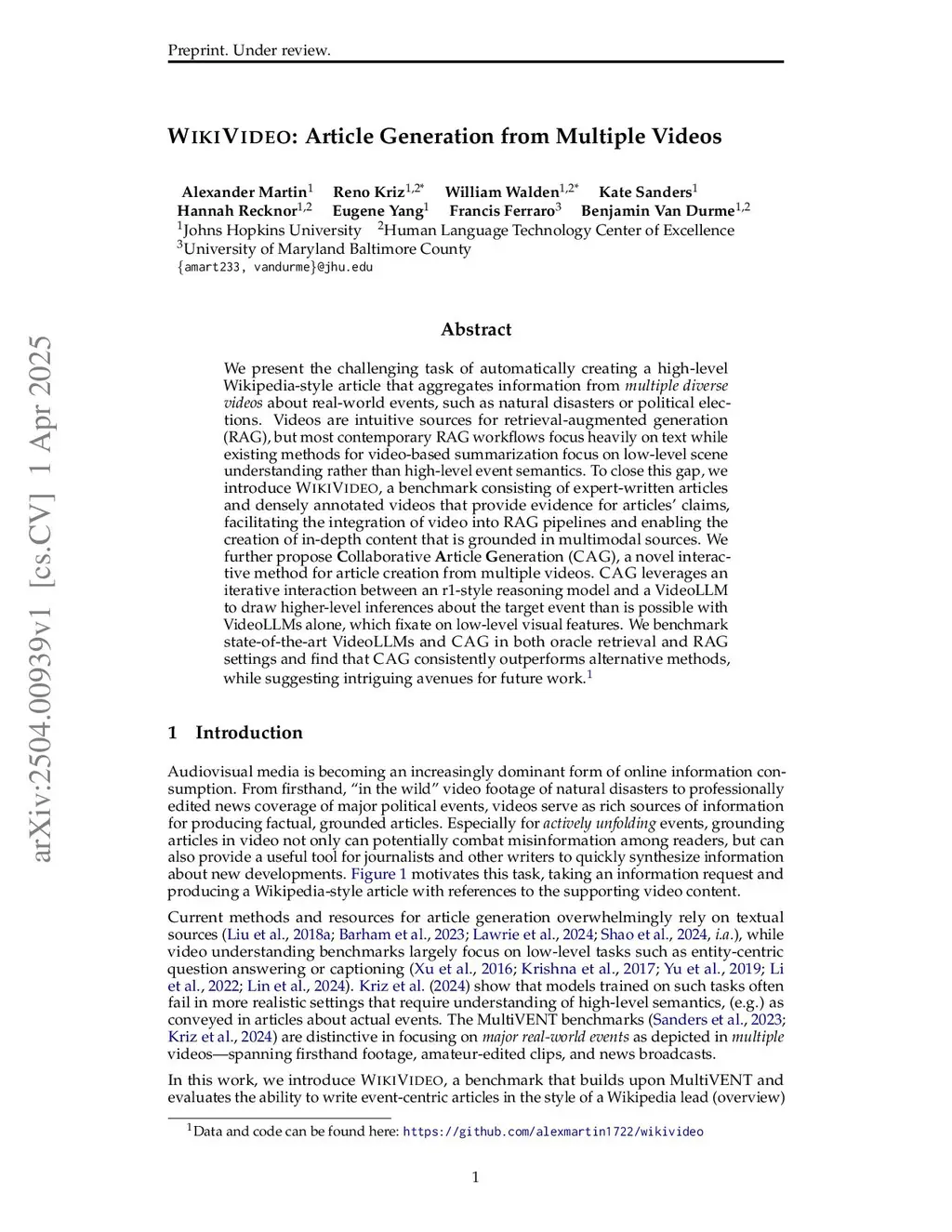 WikiVideo: Article Generation from Multiple Videos