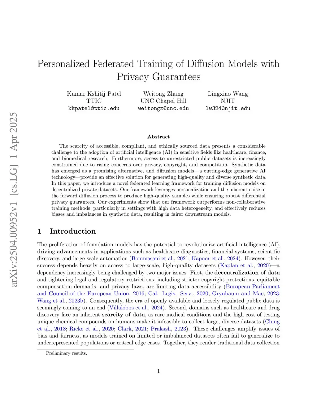 The scarcity of accessible, compliant, and ethically sourced data presents a considerable challenge to the adoption of artificial intelligence (AI) in sensitive fields like healthcare, finance, and biomedical research. Furthermore, access to unrestricted public datasets is increasingly constrained due to rising concerns over privacy, copyright, and competition. Synthetic data has emerged as a promising alternative, and diffusion models -- a cutting-edge generative AI technology -- provide an effective solution for generating high-quality and diverse synthetic data. In this paper, we introduce a novel federated learning framework for training diffusion models on decentralized private datasets. Our framework leverages personalization and the inherent noise in the forward diffusion process to produce high-quality samples while ensuring robust differential privacy guarantees. Our experiments show that our framework outperforms non-collaborative training methods, particularly in settings with high data heterogeneity, and effectively reduces biases and imbalances in synthetic data, resulting in fairer downstream models.