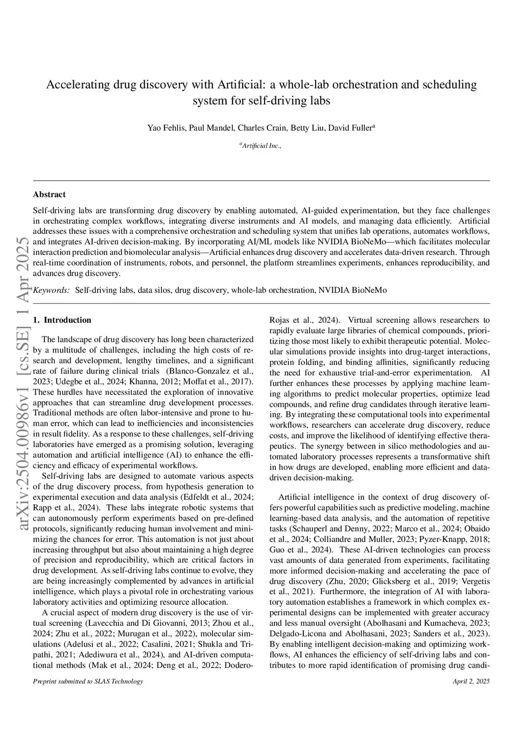 Self-driving labs are transforming drug discovery by enabling automated, AI-guided experimentation, but they face challenges in orchestrating complex workflows, integrating diverse instruments and AI models, and managing data efficiently. Artificial addresses these issues with a comprehensive orchestration and scheduling system that unifies lab operations, automates workflows, and integrates AI-driven decision-making. By incorporating AI/ML models like NVIDIA BioNeMo - which facilitates molecular interaction prediction and biomolecular analysis - Artificial enhances drug discovery and accelerates data-driven research. Through real-time coordination of instruments, robots, and personnel, the platform streamlines experiments, enhances reproducibility, and advances drug discovery.