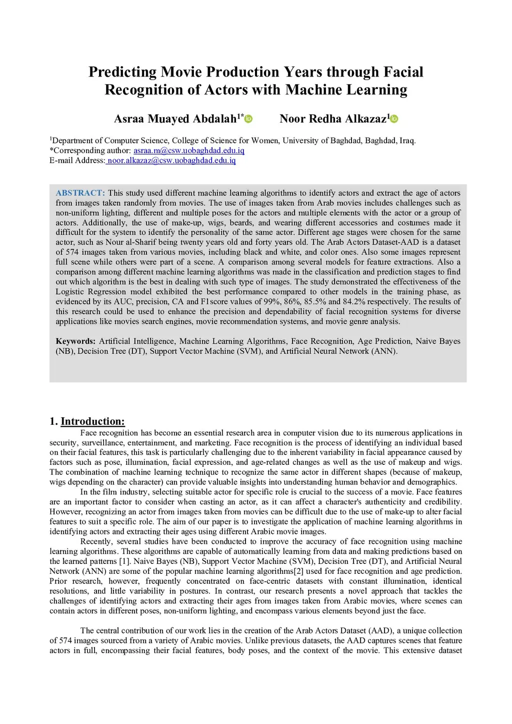 This study used machine learning algorithms to identify actors and extract the age of actors from images taken randomly from movies. The use of images taken from Arab movies includes challenges such as non-uniform lighting, different and multiple poses for the actors and multiple elements with the actor or a group of actors. Additionally, the use of make-up, wigs, beards, and wearing different accessories and costumes made it difficult for the system to identify the personality of the same actor. The Arab Actors Dataset-AAD comprises 574 images sourced from various movies, encompassing both black and white as well as color compositions. The images depict complete scenes or fragments thereof. Multiple models were employed for feature extraction, and diverse machine learning algorithms were utilized during the classification and prediction stages to determine the most effective algorithm for handling such image types. The study demonstrated the effectiveness of the Logistic Regression model exhibited the best performance compared to other models in the training phase, as evidenced by its AUC, precision, CA and F1score values of 99%, 86%, 85.5% and 84.2% respectively. The findings of this study can be used to improve the precision and reliability of facial recognition technology for various uses as with movies search services, movie suggestion algorithms, and genre classification of movies.
