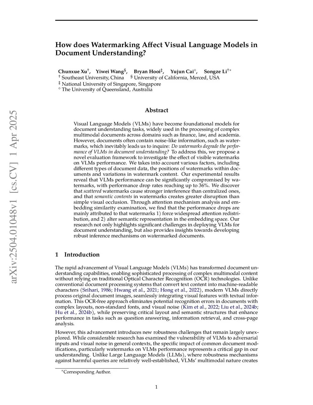 Visual Language Models (VLMs) have become foundational models for document understanding tasks, widely used in the processing of complex multimodal documents across domains such as finance, law, and academia. However, documents often contain noise-like information, such as watermarks, which inevitably leads us to inquire: \emph{Do watermarks degrade the performance of VLMs in document understanding?} To address this, we propose a novel evaluation framework to investigate the effect of visible watermarks on VLMs performance. We takes into account various factors, including different types of document data, the positions of watermarks within documents and variations in watermark content. Our experimental results reveal that VLMs performance can be significantly compromised by watermarks, with performance drop rates reaching up to 36\%. We discover that \emph{scattered} watermarks cause stronger interference than centralized ones, and that \emph{semantic contents} in watermarks creates greater disruption than simple visual occlusion. Through attention mechanism analysis and embedding similarity examination, we find that the performance drops are mainly attributed to that watermarks 1) force widespread attention redistribution, and 2) alter semantic representation in the embedding space. Our research not only highlights significant challenges in deploying VLMs for document understanding, but also provides insights towards developing robust inference mechanisms on watermarked documents.