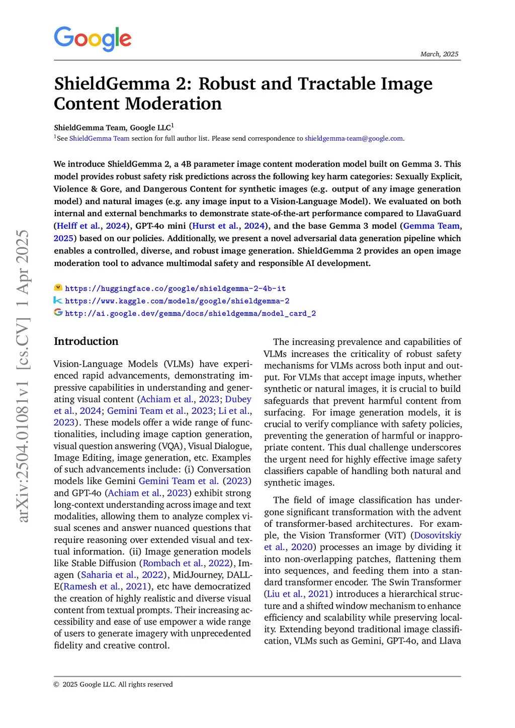 We introduce ShieldGemma 2, a 4B parameter image content moderation model built on Gemma 3. This model provides robust safety risk predictions across the following key harm categories: Sexually Explicit, Violence \& Gore, and Dangerous Content for synthetic images (e.g. output of any image generation model) and natural images (e.g. any image input to a Vision-Language Model). We evaluated on both internal and external benchmarks to demonstrate state-of-the-art performance compared to LlavaGuard \citep{helff2024llavaguard}, GPT-4o mini \citep{hurst2024gpt}, and the base Gemma 3 model \citep{gemma_2025} based on our policies. Additionally, we present a novel adversarial data generation pipeline which enables a controlled, diverse, and robust image generation. ShieldGemma 2 provides an open image moderation tool to advance multimodal safety and responsible AI development.