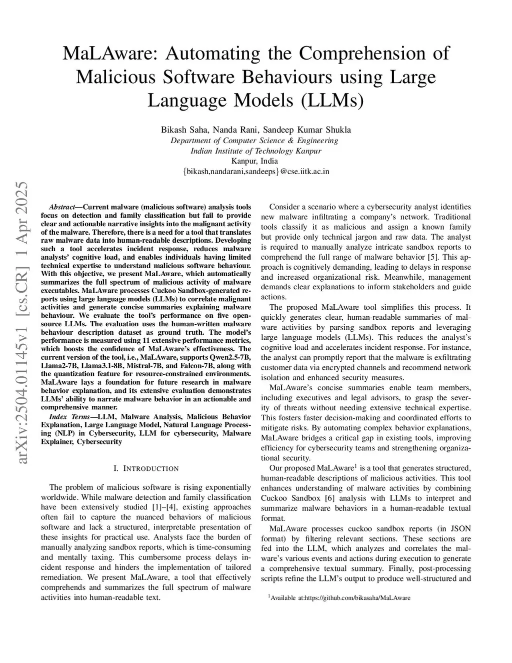 MaLAware: Automating the Comprehension of Malicious Software Behaviours using Large Language Models (LLMs)
