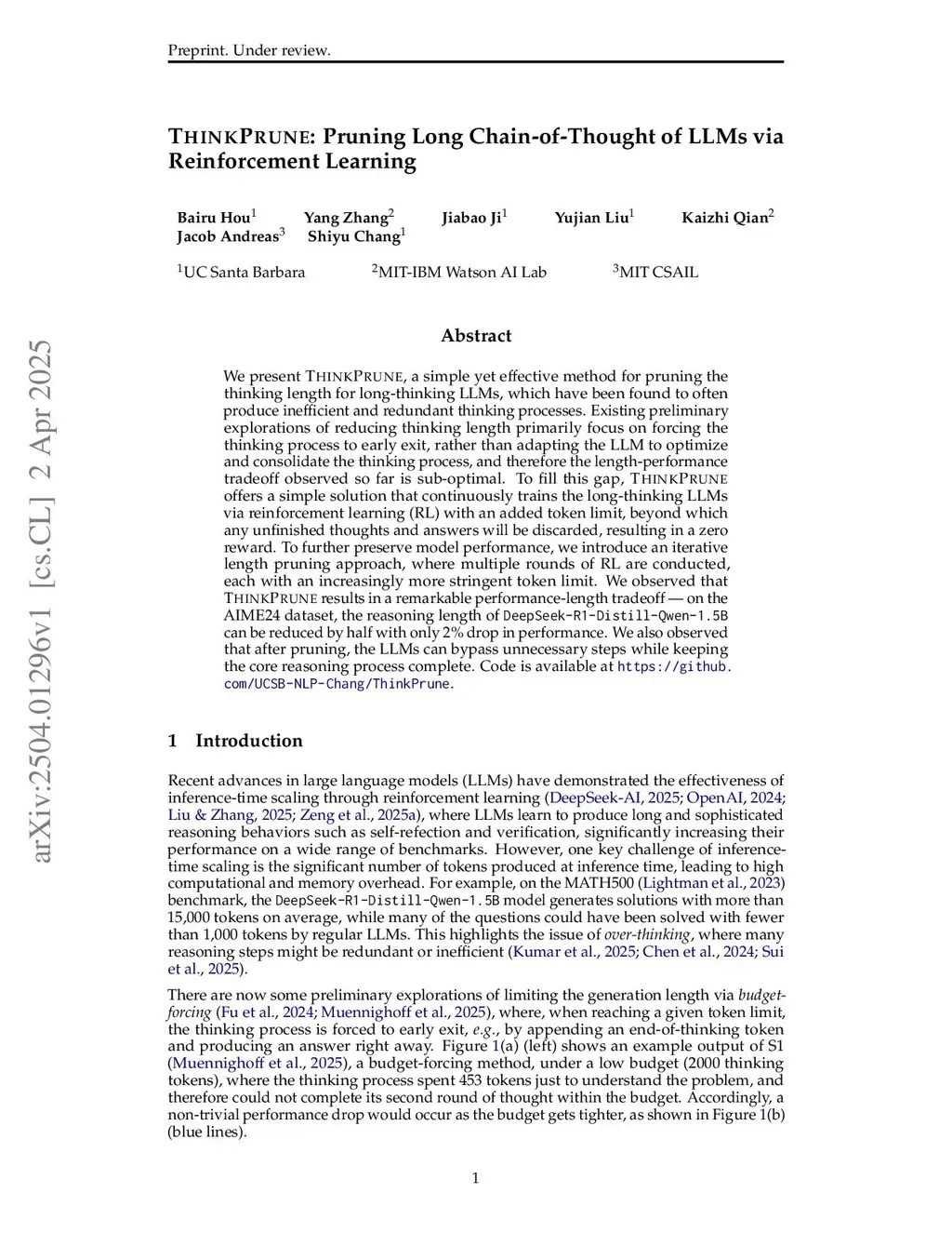 We present ThinkPrune, a simple yet effective method for pruning the thinking length for long-thinking LLMs, which has been found to often produce inefficient and redundant thinking processes. Existing preliminary explorations of reducing thinking length primarily focus on forcing the thinking process to early exit, rather than adapting the LLM to optimize and consolidate the thinking process, and therefore the length-performance tradeoff observed so far is sub-optimal. To fill this gap, ThinkPrune offers a simple solution that continuously trains the long-thinking LLMs via reinforcement learning (RL) with an added token limit, beyond which any unfinished thoughts and answers will be discarded, resulting in a zero reward. To further preserve model performance, we introduce an iterative length pruning approach, where multiple rounds of RL are conducted, each with an increasingly more stringent token limit. We observed that ThinkPrune results in a remarkable performance-length tradeoff -- on the AIME24 dataset, the reasoning length of DeepSeek-R1-Distill-Qwen-1.5B can be reduced by half with only 2% drop in performance. We also observed that after pruning, the LLMs can bypass unnecessary steps while keeping the core reasoning process complete. Code is available atthis https URL.