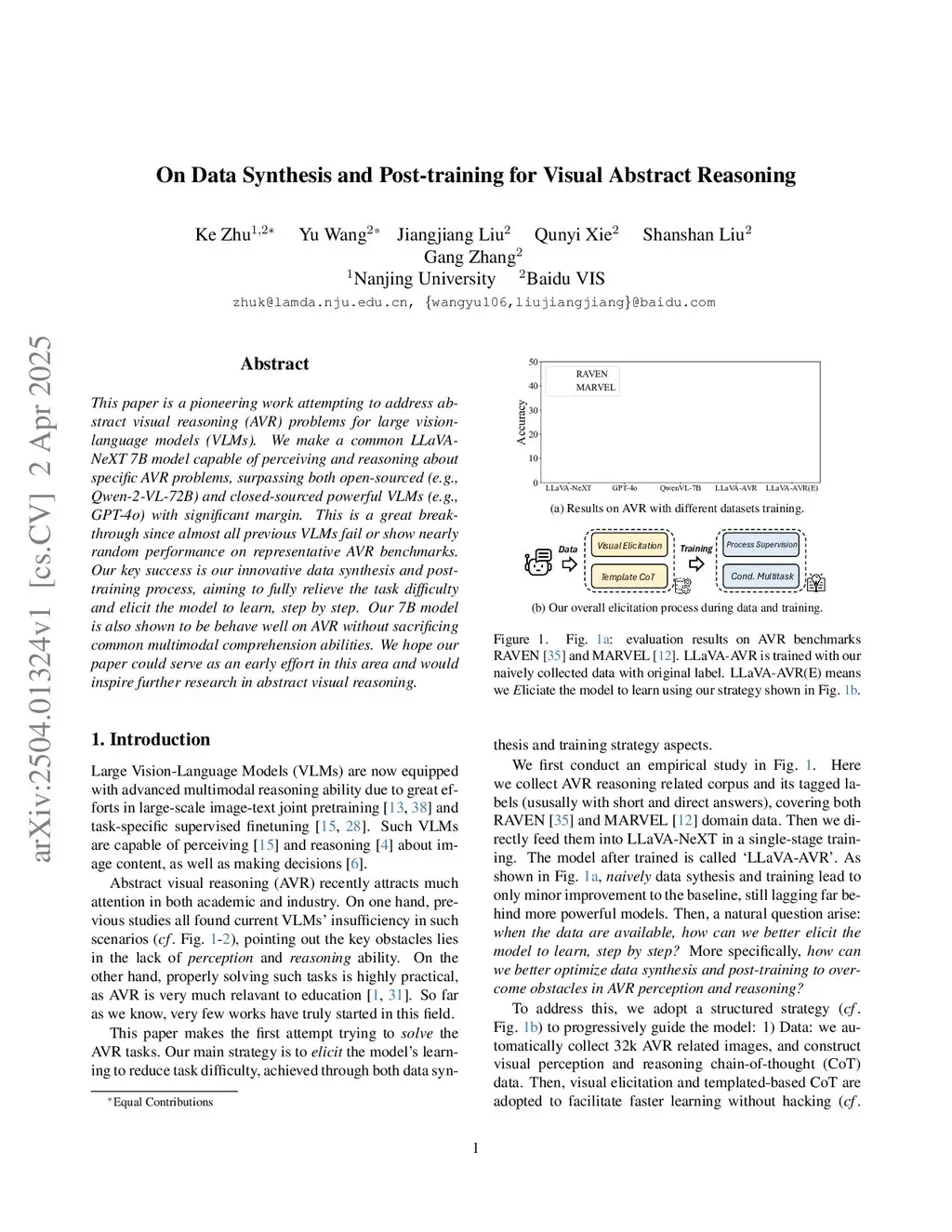 This paper is a pioneering work attempting to address abstract visual reasoning (AVR) problems for large vision-language models (VLMs). We make a common LLaVA-NeXT 7B model capable of perceiving and reasoning about specific AVR problems, surpassing both open-sourced (e.g., Qwen-2-VL-72B) and closed-sourced powerful VLMs (e.g., GPT-4o) with significant margin. This is a great breakthrough since almost all previous VLMs fail or show nearly random performance on representative AVR benchmarks. Our key success is our innovative data synthesis and post-training process, aiming to fully relieve the task difficulty and elicit the model to learn, step by step. Our 7B model is also shown to be behave well on AVR without sacrificing common multimodal comprehension abilities. We hope our paper could serve as an early effort in this area and would inspire further research in abstract visual reasoning.