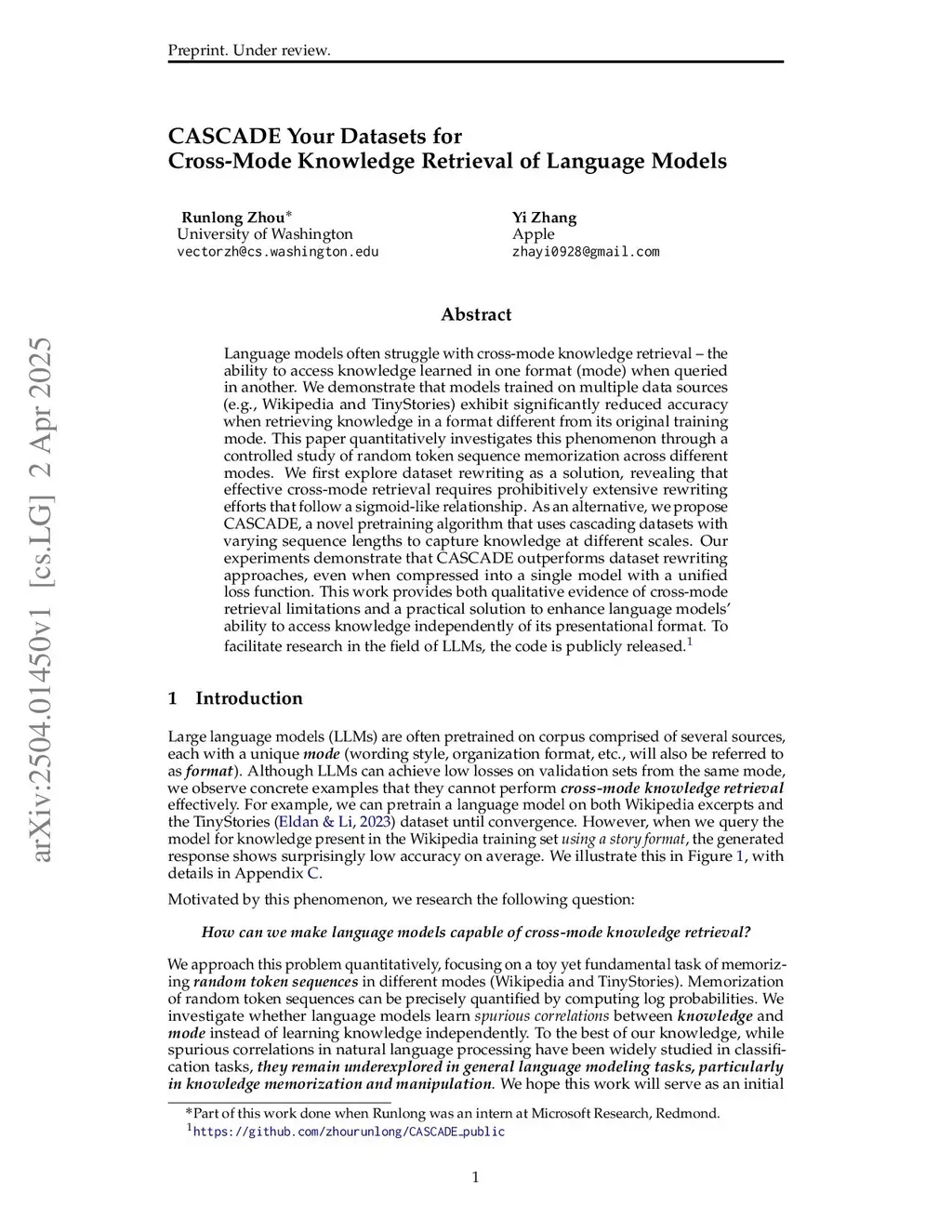 Language models often struggle with cross-mode knowledge retrieval -- the ability to access knowledge learned in one format (mode) when queried in another. We demonstrate that models trained on multiple data sources (e.g., Wikipedia and TinyStories) exhibit significantly reduced accuracy when retrieving knowledge in a format different from its original training mode. This paper quantitatively investigates this phenomenon through a controlled study of random token sequence memorization across different modes. We first explore dataset rewriting as a solution, revealing that effective cross-mode retrieval requires prohibitively extensive rewriting efforts that follow a sigmoid-like relationship. As an alternative, we propose CASCADE, a novel pretraining algorithm that uses cascading datasets with varying sequence lengths and computing losses on only the second half of each training sequence to capture knowledge at different scales. Our experiments demonstrate that CASCADE outperforms dataset rewriting approaches, even when compressed into a single model with a unified loss function. This work provides both qualitative evidence of cross-mode retrieval limitations and a practical solution to enhance language models' ability to access knowledge independently of its presentational format.