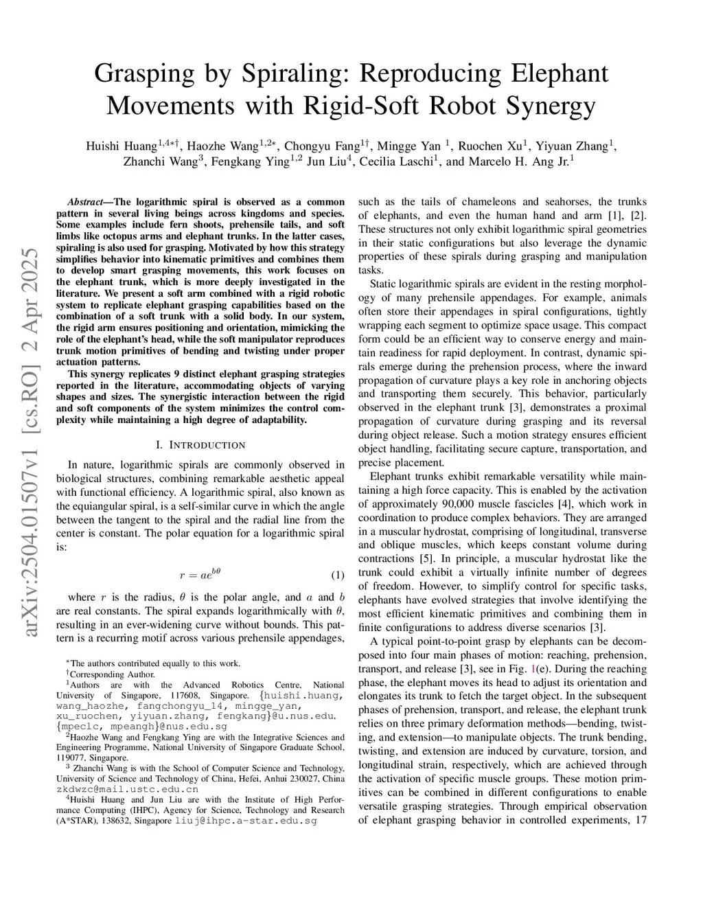 Grasping by Spiraling: Reproducing Elephant Movements with Rigid-Soft Robot Synergy