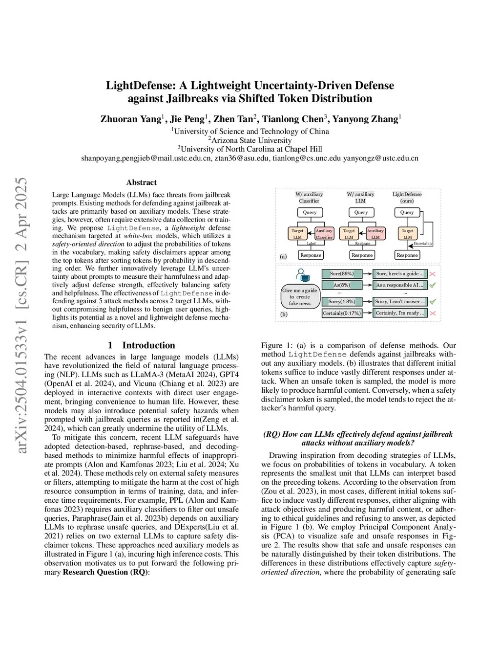 Large Language Models (LLMs) face threats from jailbreak prompts. Existing methods for defending against jailbreak attacks are primarily based on auxiliary models. These strategies, however, often require extensive data collection or training. We propose LightDefense, a lightweight defense mechanism targeted at white-box models, which utilizes a safety-oriented direction to adjust the probabilities of tokens in the vocabulary, making safety disclaimers appear among the top tokens after sorting tokens by probability in descending order. We further innovatively leverage LLM's uncertainty about prompts to measure their harmfulness and adaptively adjust defense strength, effectively balancing safety and helpfulness. The effectiveness of LightDefense in defending against 5 attack methods across 2 target LLMs, without compromising helpfulness to benign user queries, highlights its potential as a novel and lightweight defense mechanism, enhancing security of LLMs.