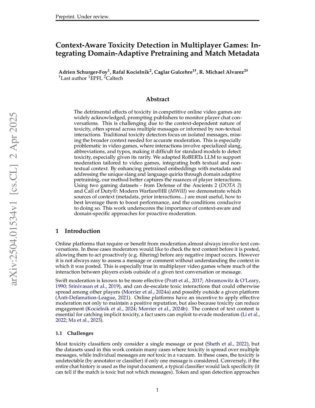 The detrimental effects of toxicity in competitive online video games are widely acknowledged, prompting publishers to monitor player chat conversations. This is challenging due to the context-dependent nature of toxicity, often spread across multiple messages or informed by non-textual interactions. Traditional toxicity detectors focus on isolated messages, missing the broader context needed for accurate moderation. This is especially problematic in video games, where interactions involve specialized slang, abbreviations, and typos, making it difficult for standard models to detect toxicity, especially given its rarity. We adapted RoBERTa LLM to support moderation tailored to video games, integrating both textual and non-textual context. By enhancing pretrained embeddings with metadata and addressing the unique slang and language quirks through domain adaptive pretraining, our method better captures the nuances of player interactions. Using two gaming datasets - from Defense of the Ancients 2 (DOTA 2) and Call of Duty: Modern WarfareIII (MWIII) we demonstrate which sources of context (metadata, prior interactions...) are most useful, how to best leverage them to boost performance, and the conditions conducive to doing so. This work underscores the importance of context-aware and domain-specific approaches for proactive moderation.