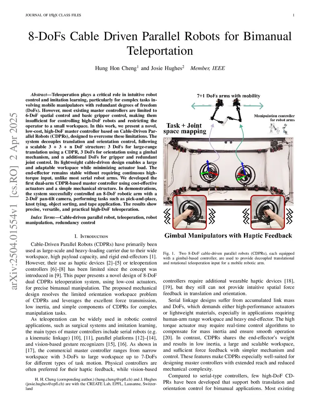 8-DoFs Cable Driven Parallel Robots for Bimanual Teleportation