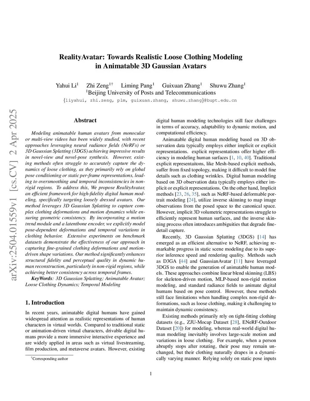Modeling animatable human avatars from monocular or multi-view videos has been widely studied, with recent approaches leveraging neural radiance fields (NeRFs) or 3D Gaussian Splatting (3DGS) achieving impressive results in novel-view and novel-pose synthesis. However, existing methods often struggle to accurately capture the dynamics of loose clothing, as they primarily rely on global pose conditioning or static per-frame representations, leading to oversmoothing and temporal inconsistencies in non-rigid regions. To address this, We propose RealityAvatar, an efficient framework for high-fidelity digital human modeling, specifically targeting loosely dressed avatars. Our method leverages 3D Gaussian Splatting to capture complex clothing deformations and motion dynamics while ensuring geometric consistency. By incorporating a motion trend module and a latentbone encoder, we explicitly model pose-dependent deformations and temporal variations in clothing behavior. Extensive experiments on benchmark datasets demonstrate the effectiveness of our approach in capturing fine-grained clothing deformations and motion-driven shape variations. Our method significantly enhances structural fidelity and perceptual quality in dynamic human reconstruction, particularly in non-rigid regions, while achieving better consistency across temporal frames.