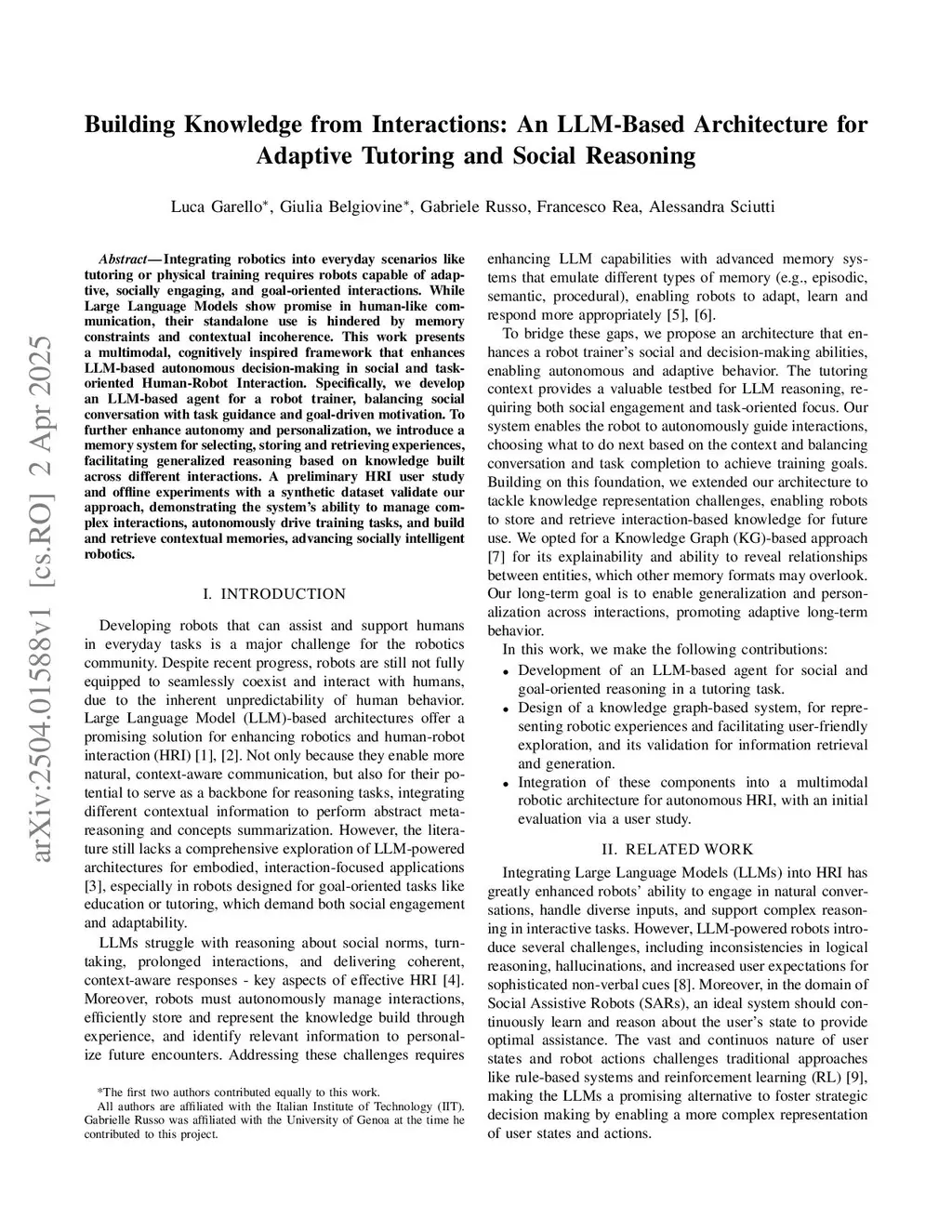 Building Knowledge from Interactions: An LLM-Based Architecture for Adaptive Tutoring and Social Reasoning