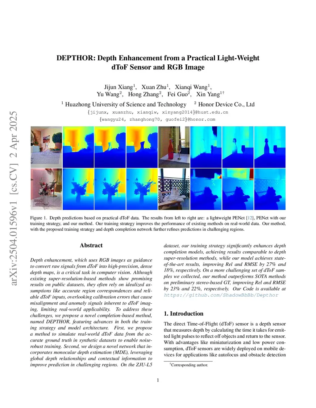 Depth enhancement, which uses RGB images as guidance to convert raw signals from dToF into high-precision, dense depth maps, is a critical task in computer vision. Although existing super-resolution-based methods show promising results on public datasets, they often rely on idealized assumptions like accurate region correspondences and reliable dToF inputs, overlooking calibration errors that cause misalignment and anomaly signals inherent to dToF imaging, limiting real-world applicability. To address these challenges, we propose a novel completion-based method, named DEPTHOR, featuring advances in both the training strategy and model architecture. First, we propose a method to simulate real-world dToF data from the accurate ground truth in synthetic datasets to enable noise-robust training. Second, we design a novel network that incorporates monocular depth estimation (MDE), leveraging global depth relationships and contextual information to improve prediction in challenging regions. On the ZJU-L5 dataset, our training strategy significantly enhances depth completion models, achieving results comparable to depth super-resolution methods, while our model achieves state-of-the-art results, improving Rel and RMSE by 27% and 18%, respectively. On a more challenging set of dToF samples we collected, our method outperforms SOTA methods on preliminary stereo-based GT, improving Rel and RMSE by 23% and 22%, respectively. Our Code is available atthis https URL