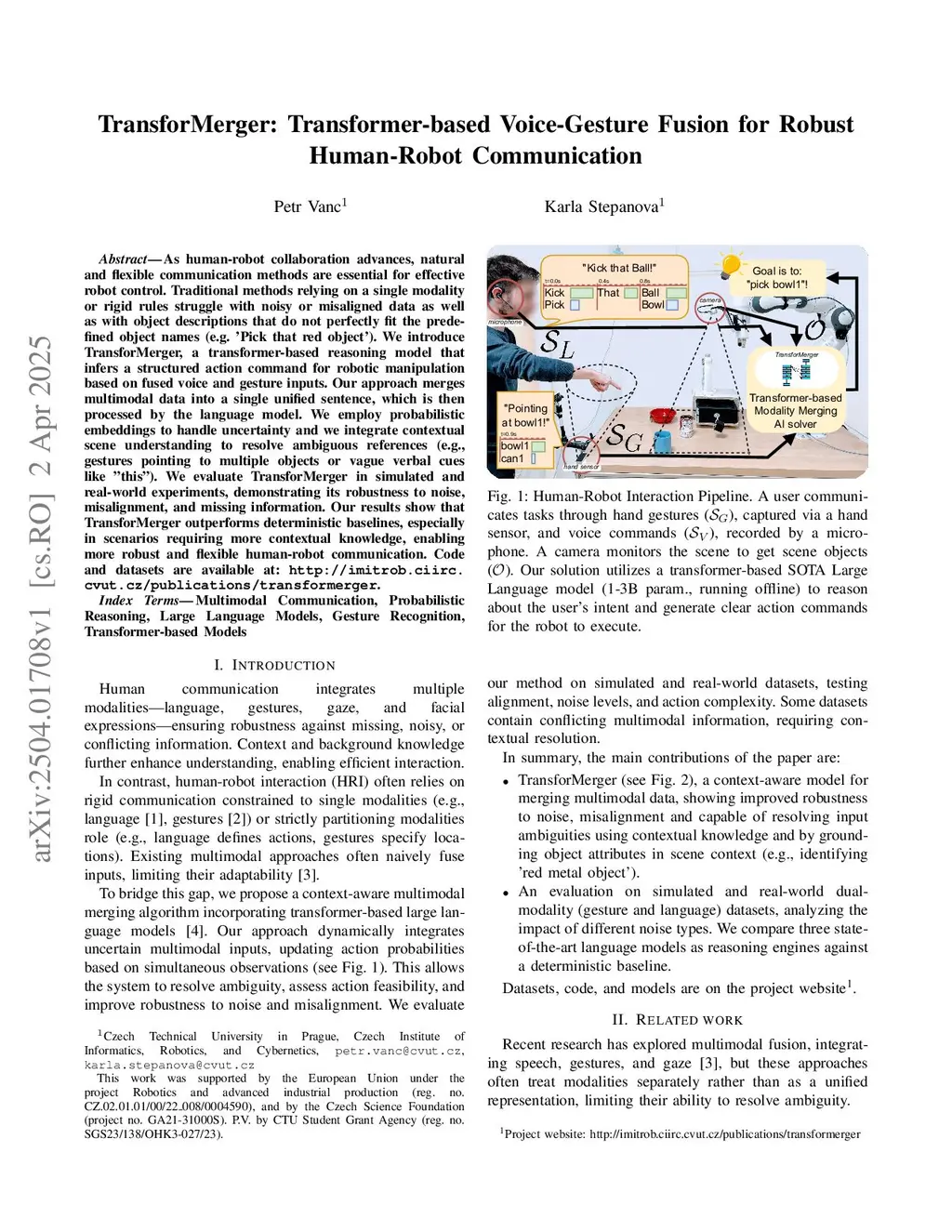 As human-robot collaboration advances, natural and flexible communication methods are essential for effective robot control. Traditional methods relying on a single modality or rigid rules struggle with noisy or misaligned data as well as with object descriptions that do not perfectly fit the predefined object names (e.g. 'Pick that red object'). We introduce TransforMerger, a transformer-based reasoning model that infers a structured action command for robotic manipulation based on fused voice and gesture inputs. Our approach merges multimodal data into a single unified sentence, which is then processed by the language model. We employ probabilistic embeddings to handle uncertainty and we integrate contextual scene understanding to resolve ambiguous references (e.g., gestures pointing to multiple objects or vague verbal cues like "this"). We evaluate TransforMerger in simulated and real-world experiments, demonstrating its robustness to noise, misalignment, and missing information. Our results show that TransforMerger outperforms deterministic baselines, especially in scenarios requiring more contextual knowledge, enabling more robust and flexible human-robot communication. Code and datasets are available at:this http URL.