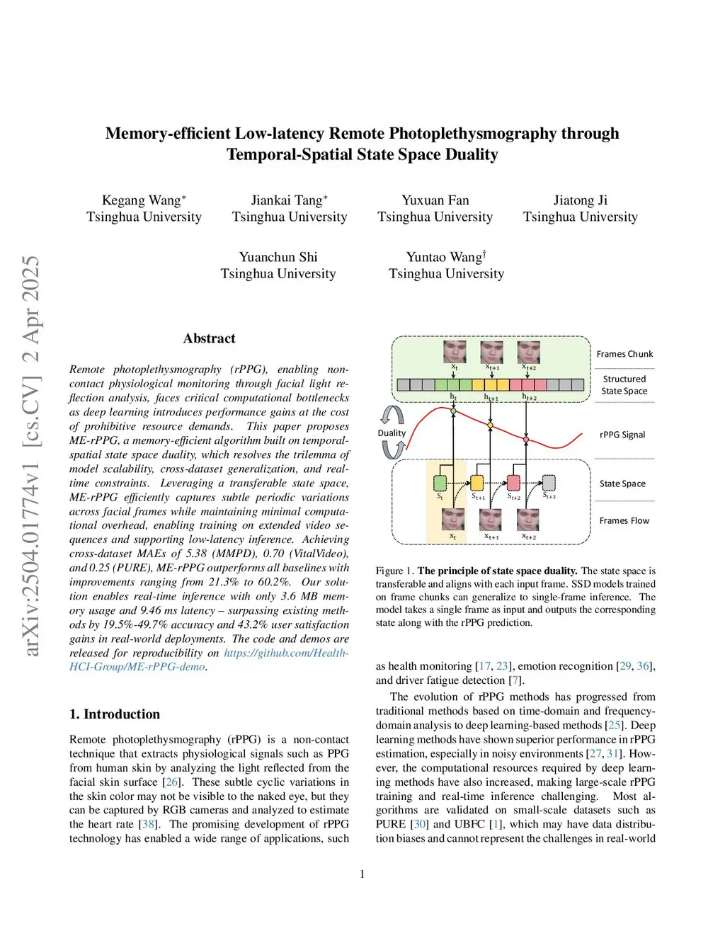 Remote photoplethysmography (rPPG), enabling non-contact physiological monitoring through facial light reflection analysis, faces critical computational bottlenecks as deep learning introduces performance gains at the cost of prohibitive resource demands. This paper proposes ME-rPPG, a memory-efficient algorithm built on temporal-spatial state space duality, which resolves the trilemma of model scalability, cross-dataset generalization, and real-time constraints. Leveraging a transferable state space, ME-rPPG efficiently captures subtle periodic variations across facial frames while maintaining minimal computational overhead, enabling training on extended video sequences and supporting low-latency inference. Achieving cross-dataset MAEs of 5.38 (MMPD), 0.70 (VitalVideo), and 0.25 (PURE), ME-rPPG outperforms all baselines with improvements ranging from 21.3% to 60.2%. Our solution enables real-time inference with only 3.6 MB memory usage and 9.46 ms latency -- surpassing existing methods by 19.5%-49.7% accuracy and 43.2% user satisfaction gains in real-world deployments. The code and demos are released for reproducibility onthis https URL.