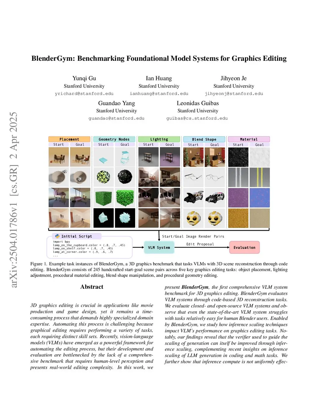 3D graphics editing is crucial in applications like movie production and game design, yet it remains a time-consuming process that demands highly specialized domain expertise. Automating this process is challenging because graphical editing requires performing a variety of tasks, each requiring distinct skill sets. Recently, vision-language models (VLMs) have emerged as a powerful framework for automating the editing process, but their development and evaluation are bottlenecked by the lack of a comprehensive benchmark that requires human-level perception and presents real-world editing complexity. In this work, we present BlenderGym, the first comprehensive VLM system benchmark for 3D graphics editing. BlenderGym evaluates VLM systems through code-based 3D reconstruction tasks. We evaluate closed- and open-source VLM systems and observe that even the state-of-the-art VLM system struggles with tasks relatively easy for human Blender users. Enabled by BlenderGym, we study how inference scaling techniques impact VLM's performance on graphics editing tasks. Notably, our findings reveal that the verifier used to guide the scaling of generation can itself be improved through inference scaling, complementing recent insights on inference scaling of LLM generation in coding and math tasks. We further show that inference compute is not uniformly effective and can be optimized by strategically distributing it between generation and verification.