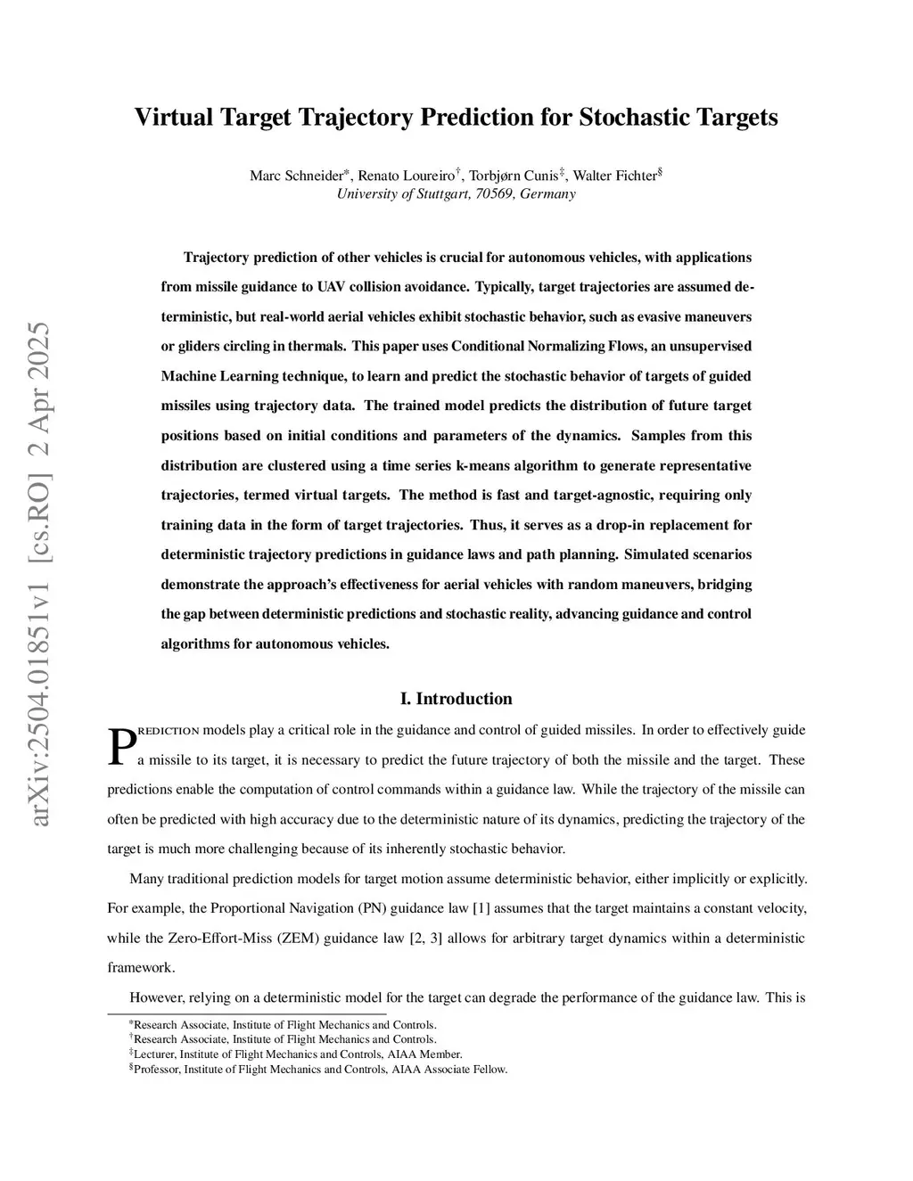 Trajectory prediction of aerial vehicles is a key requirement in applications ranging from missile guidance to UAV collision avoidance. While most prediction methods assume deterministic target motion, real-world targets often exhibit stochastic behaviors such as evasive maneuvers or random gliding patterns. This paper introduces a probabilistic framework based on Conditional Normalizing Flows (CNFs) to model and predict such stochastic dynamics directly from trajectory data. The learned model generates probability distributions of future target positions conditioned on initial states and dynamic parameters, enabling efficient sampling and exact density evaluation. To provide deterministic surrogates compatible with existing guidance and planning algorithms, sampled trajectories are clustered using a time series k-means approach, yielding a set of representative "virtual target" trajectories. The method is target-agnostic, computationally efficient, and requires only trajectory data for training, making it suitable as a drop-in replacement for deterministic predictors. Simulated scenarios with maneuvering and ballistic targets demonstrate that the proposed approach bridges the gap between deterministic assumptions and stochastic reality, advancing guidance and control algorithms for autonomous vehicles.