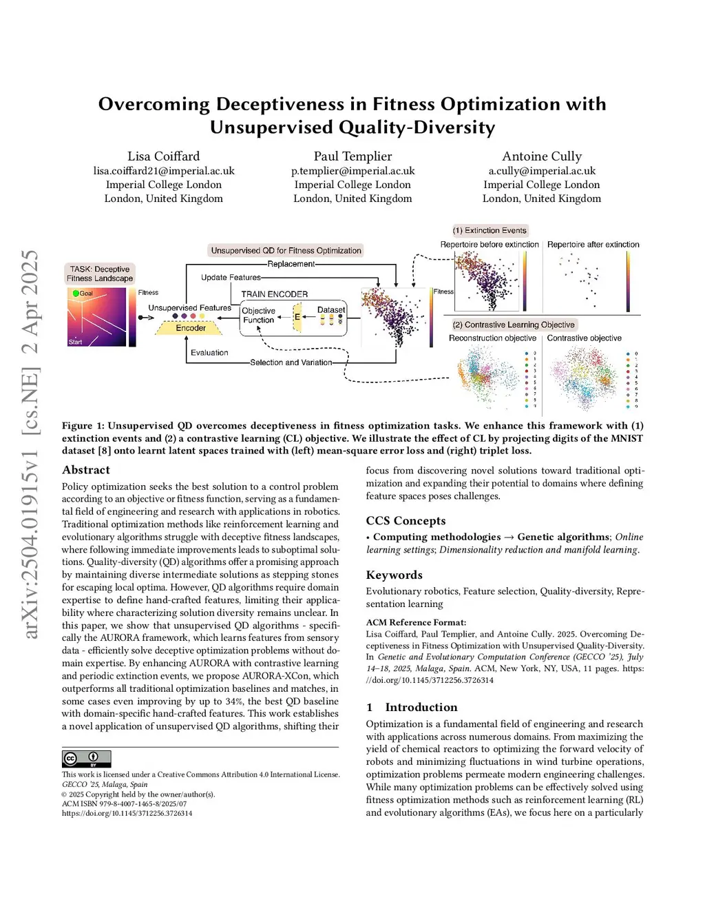 Policy optimization seeks the best solution to a control problem according to an objective or fitness function, serving as a fundamental field of engineering and research with applications in robotics. Traditional optimization methods like reinforcement learning and evolutionary algorithms struggle with deceptive fitness landscapes, where following immediate improvements leads to suboptimal solutions. Quality-diversity (QD) algorithms offer a promising approach by maintaining diverse intermediate solutions as stepping stones for escaping local optima. However, QD algorithms require domain expertise to define hand-crafted features, limiting their applicability where characterizing solution diversity remains unclear. In this paper, we show that unsupervised QD algorithms - specifically the AURORA framework, which learns features from sensory data - efficiently solve deceptive optimization problems without domain expertise. By enhancing AURORA with contrastive learning and periodic extinction events, we propose AURORA-XCon, which outperforms all traditional optimization baselines and matches, in some cases even improving by up to 34%, the best QD baseline with domain-specific hand-crafted features. This work establishes a novel application of unsupervised QD algorithms, shifting their focus from discovering novel solutions toward traditional optimization and expanding their potential to domains where defining feature spaces poses challenges.