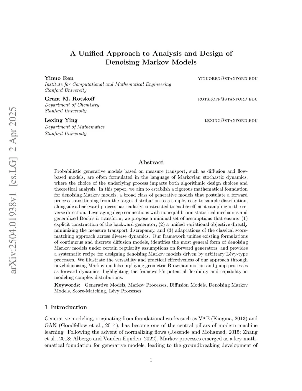 Probabilistic generative models based on measure transport, such as diffusion and flow-based models, are often formulated in the language of Markovian stochastic dynamics, where the choice of the underlying process impacts both algorithmic design choices and theoretical analysis. In this paper, we aim to establish a rigorous mathematical foundation for denoising Markov models, a broad class of generative models that postulate a forward process transitioning from the target distribution to a simple, easy-to-sample distribution, alongside a backward process particularly constructed to enable efficient sampling in the reverse direction. Leveraging deep connections with nonequilibrium statistical mechanics and generalized Doob's -transform, we propose a minimal set of assumptions that ensure: (1) explicit construction of the backward generator, (2) a unified variational objective directly minimizing the measure transport discrepancy, and (3) adaptations of the classical score-matching approach across diverse dynamics. Our framework unifies existing formulations of continuous and discrete diffusion models, identifies the most general form of denoising Markov models under certain regularity assumptions on forward generators, and provides a systematic recipe for designing denoising Markov models driven by arbitrary Lévy-type processes. We illustrate the versatility and practical effectiveness of our approach through novel denoising Markov models employing geometric Brownian motion and jump processes as forward dynamics, highlighting the framework's potential flexibility and capability in modeling complex distributions.