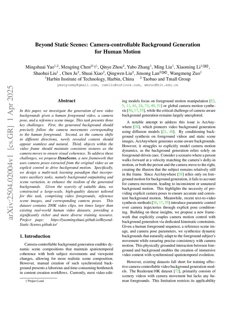 In this paper, we investigate the generation of new video backgrounds given a human foreground video, a camera pose, and a reference scene image. This task presents three key challenges. First, the generated background should precisely follow the camera movements corresponding to the human foreground. Second, as the camera shifts in different directions, newly revealed content should appear seamless and natural. Third, objects within the video frame should maintain consistent textures as the camera moves to ensure visual coherence. To address these challenges, we propose DynaScene, a new framework that uses camera poses extracted from the original video as an explicit control to drive background motion. Specifically, we design a multi-task learning paradigm that incorporates auxiliary tasks, namely background outpainting and scene variation, to enhance the realism of the generated backgrounds. Given the scarcity of suitable data, we constructed a large-scale, high-quality dataset tailored for this task, comprising video foregrounds, reference scene images, and corresponding camera poses. This dataset contains 200K video clips, ten times larger than existing real-world human video datasets, providing a significantly richer and more diverse training resource. Project page:this https URL