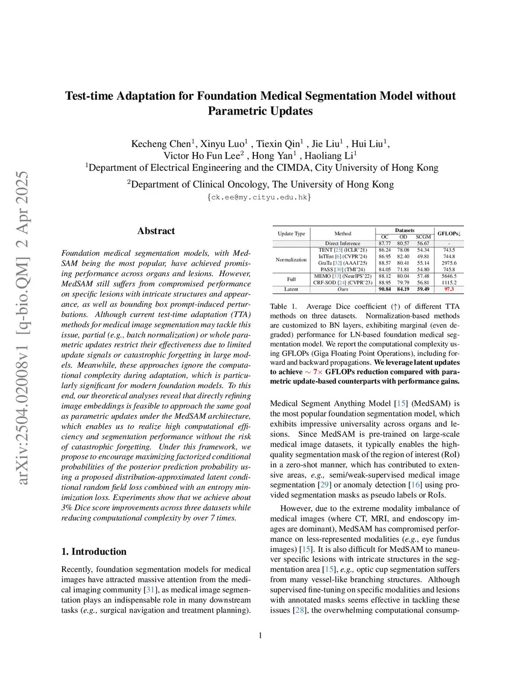 Foundation medical segmentation models, with MedSAM being the most popular, have achieved promising performance across organs and lesions. However, MedSAM still suffers from compromised performance on specific lesions with intricate structures and appearance, as well as bounding box prompt-induced perturbations. Although current test-time adaptation (TTA) methods for medical image segmentation may tackle this issue, partial (e.g., batch normalization) or whole parametric updates restrict their effectiveness due to limited update signals or catastrophic forgetting in large models. Meanwhile, these approaches ignore the computational complexity during adaptation, which is particularly significant for modern foundation models. To this end, our theoretical analyses reveal that directly refining image embeddings is feasible to approach the same goal as parametric updates under the MedSAM architecture, which enables us to realize high computational efficiency and segmentation performance without the risk of catastrophic forgetting. Under this framework, we propose to encourage maximizing factorized conditional probabilities of the posterior prediction probability using a proposed distribution-approximated latent conditional random field loss combined with an entropy minimization loss. Experiments show that we achieve about 3\% Dice score improvements across three datasets while reducing computational complexity by over 7 times.