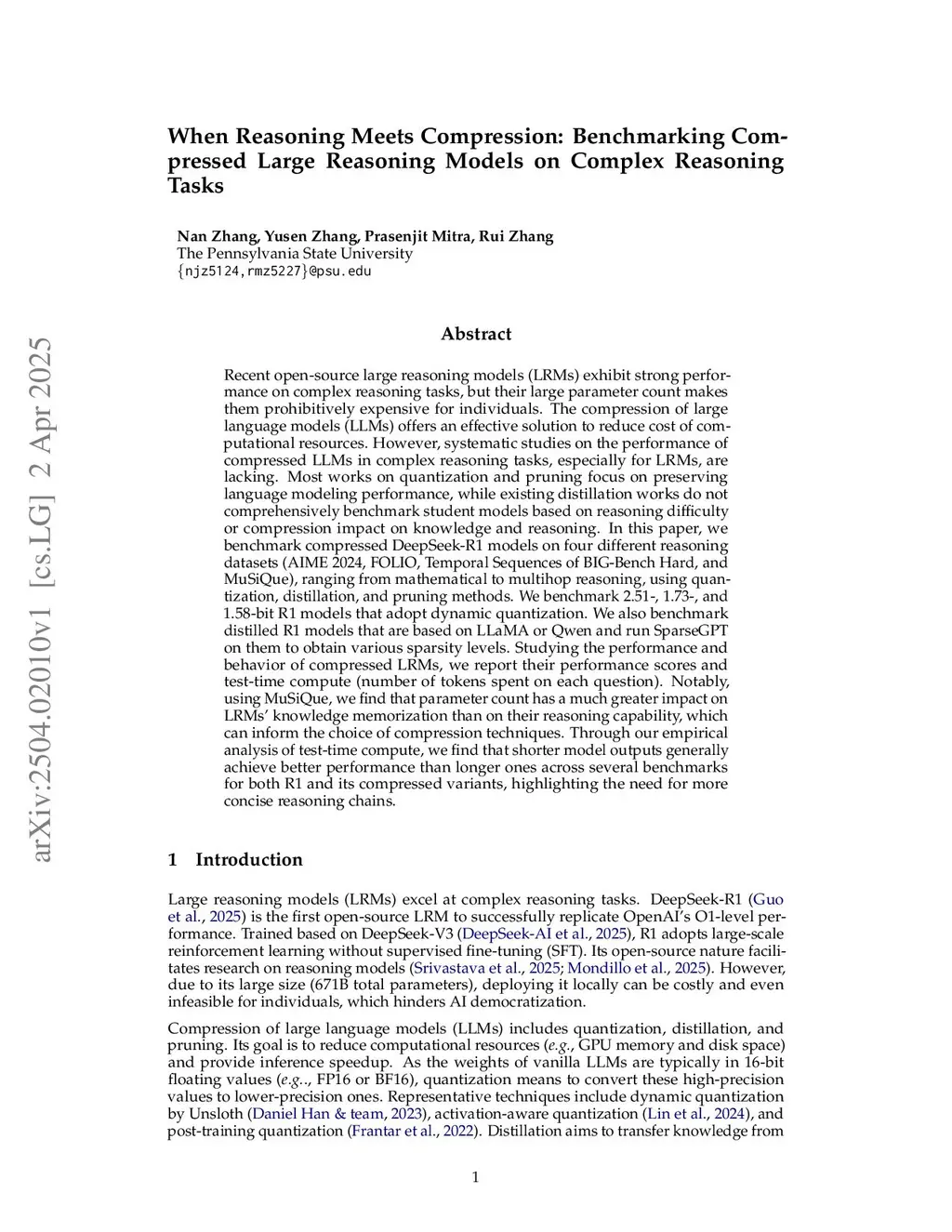 Compression methods, including quantization, distillation, and pruning, improve the computational efficiency of large reasoning models (LRMs). However, existing studies either fail to sufficiently compare all three compression methods on LRMs or lack in-depth interpretation analysis. In this paper, we investigate how the reasoning capabilities of LRMs are compromised during compression, through performance benchmarking and mechanistic interpretation. To uncover the effects of compression on reasoning performance, we benchmark quantized, distilled, and pruned DeepSeek-R1 models on four reasoning datasets (AIME 2024, FOLIO, Temporal Sequences, and MuSiQue). To precisely locate compression effects on model weights, we adapt difference of means and attribution patching techniques, focusing on the activation of every linear component in compressed LRMs, to interpret fine-grained causal relationships between weights and various reasoning capabilities. This fine-grained interpretation addresses a fundamental question of compression: which weights are the most important for reasoning? Overall, we find dynamically quantized 2.51-bit R1 reaches close-to-R1 performance. With empirical verification, we present three main findings that generalize across both Llama and Qwen: (1) Weight count has a greater impact on LRMs' knowledge memorization than reasoning, highlighting the risks of pruning and distillation; (2) The MLP up projection in the final layer of distilled LRMs is one of the most important components, offering a new perspective on locating critical weights - a fundamental problem in model compression; and (3) Current quantization methods overly compress the final-layer modules and MLP gate projections, so protecting just 2% of all weights that are excessively compressed can raise average accuracy by 6.57%, greatly surpassing the state-of-the-art.