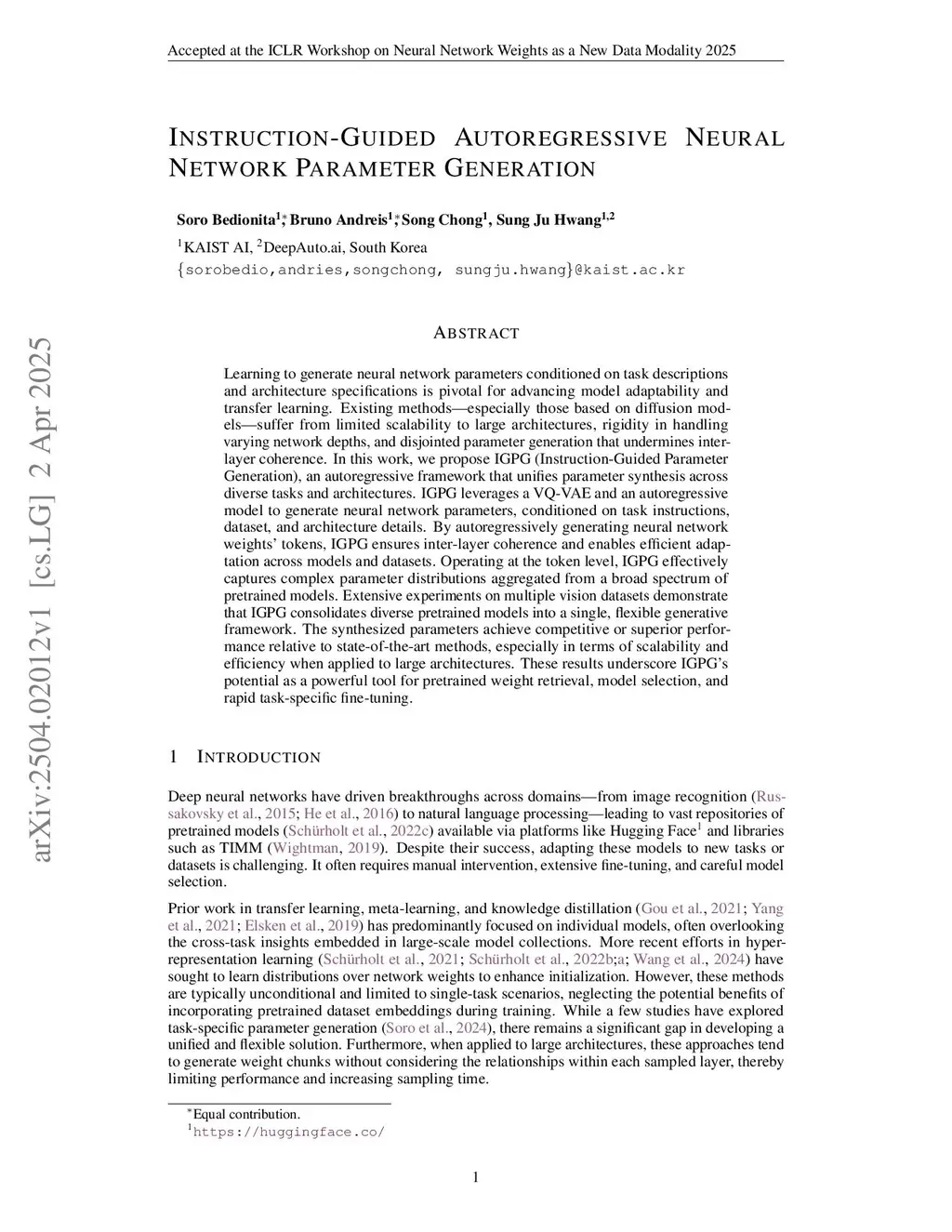 Learning to generate neural network parameters conditioned on task descriptions and architecture specifications is pivotal for advancing model adaptability and transfer learning. Existing methods especially those based on diffusion models suffer from limited scalability to large architectures, rigidity in handling varying network depths, and disjointed parameter generation that undermines inter-layer coherence. In this work, we propose IGPG (Instruction Guided Parameter Generation), an autoregressive framework that unifies parameter synthesis across diverse tasks and architectures. IGPG leverages a VQ-VAE and an autoregressive model to generate neural network parameters, conditioned on task instructions, dataset, and architecture details. By autoregressively generating neural network weights' tokens, IGPG ensures inter-layer coherence and enables efficient adaptation across models and datasets. Operating at the token level, IGPG effectively captures complex parameter distributions aggregated from a broad spectrum of pretrained models. Extensive experiments on multiple vision datasets demonstrate that IGPG consolidates diverse pretrained models into a single, flexible generative framework. The synthesized parameters achieve competitive or superior performance relative to state-of-the-art methods, especially in terms of scalability and efficiency when applied to large architectures. These results underscore ICPG potential as a powerful tool for pretrained weight retrieval, model selection, and rapid task-specific fine-tuning.