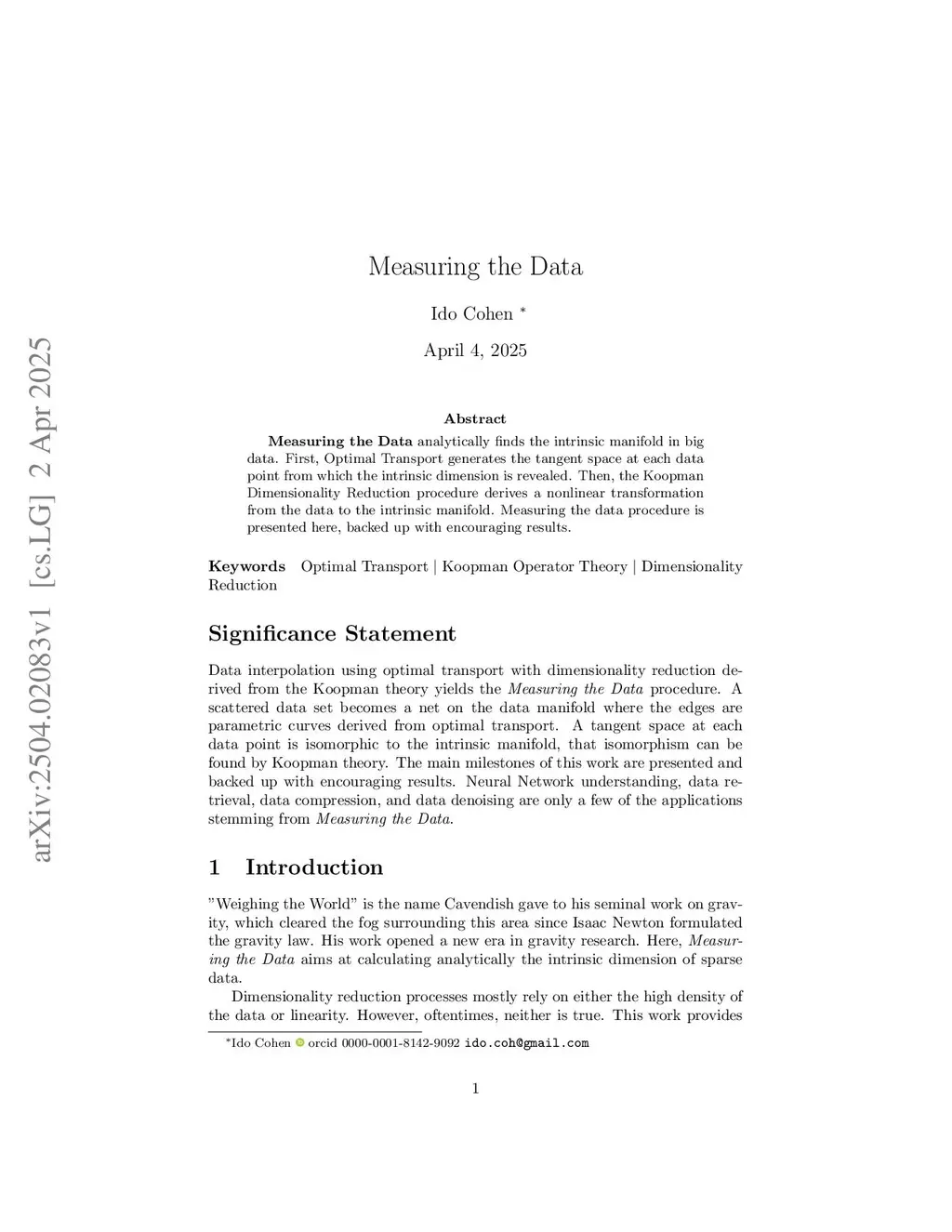 Measuring the Data analytically finds the intrinsic manifold in big data. First, Optimal Transport generates the tangent space at each data point from which the intrinsic dimension is revealed. Then, the Koopman Dimensionality Reduction procedure derives a nonlinear transformation from the data to the intrinsic manifold. Measuring the data procedure is presented here, backed up with encouraging results.
