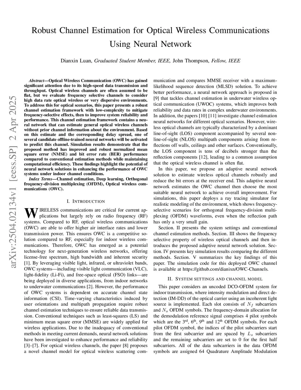 Robust Channel Estimation for Optical Wireless Communications Using Neural Network