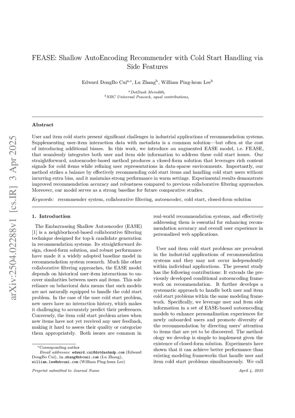 User and item cold starts present significant challenges in industrial applications of recommendation systems. Supplementing user-item interaction data with metadata is a common solution-but often at the cost of introducing additional biases. In this work, we introduce an augmented EASE model that seamlessly integrates both user and item side information to address these cold start issues. Our straightforward, autoencoder-based method produces a closed-form solution that leverages rich content signals for cold items while refining user representations in data-sparse environments. Importantly, our method strikes a balance by effectively recommending cold start items and handling cold start users without incurring extra bias, and it maintains strong performance in warm settings. Experimental results demonstrate improved recommendation accuracy and robustness compared to previous collaborative filtering approaches. Moreover, our model serves as a strong baseline for future comparative studies.