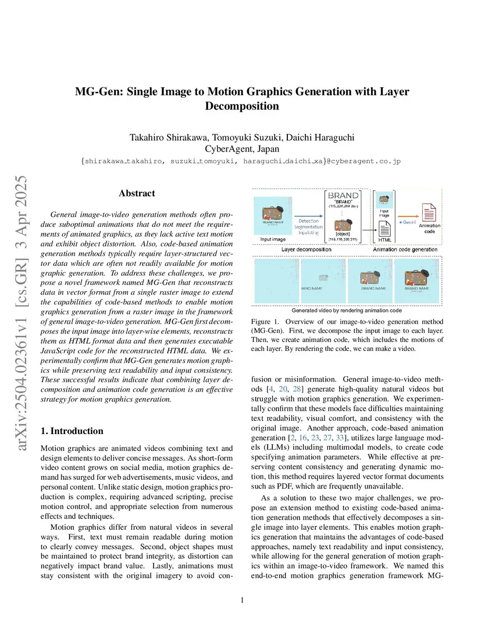 We introduce MG-Gen, a framework that generates motion graphics directly from a single raster image. MG-Gen decompose a single raster image into layered structures represented as HTML, generate animation scripts for each layer, and then render them into a video. Experiments confirm MG-Gen generates dynamic motion graphics while preserving text readability and fidelity to the input conditions, whereas state-of-the-art image-to-video generation methods struggle with them. The code is available atthis https URL.