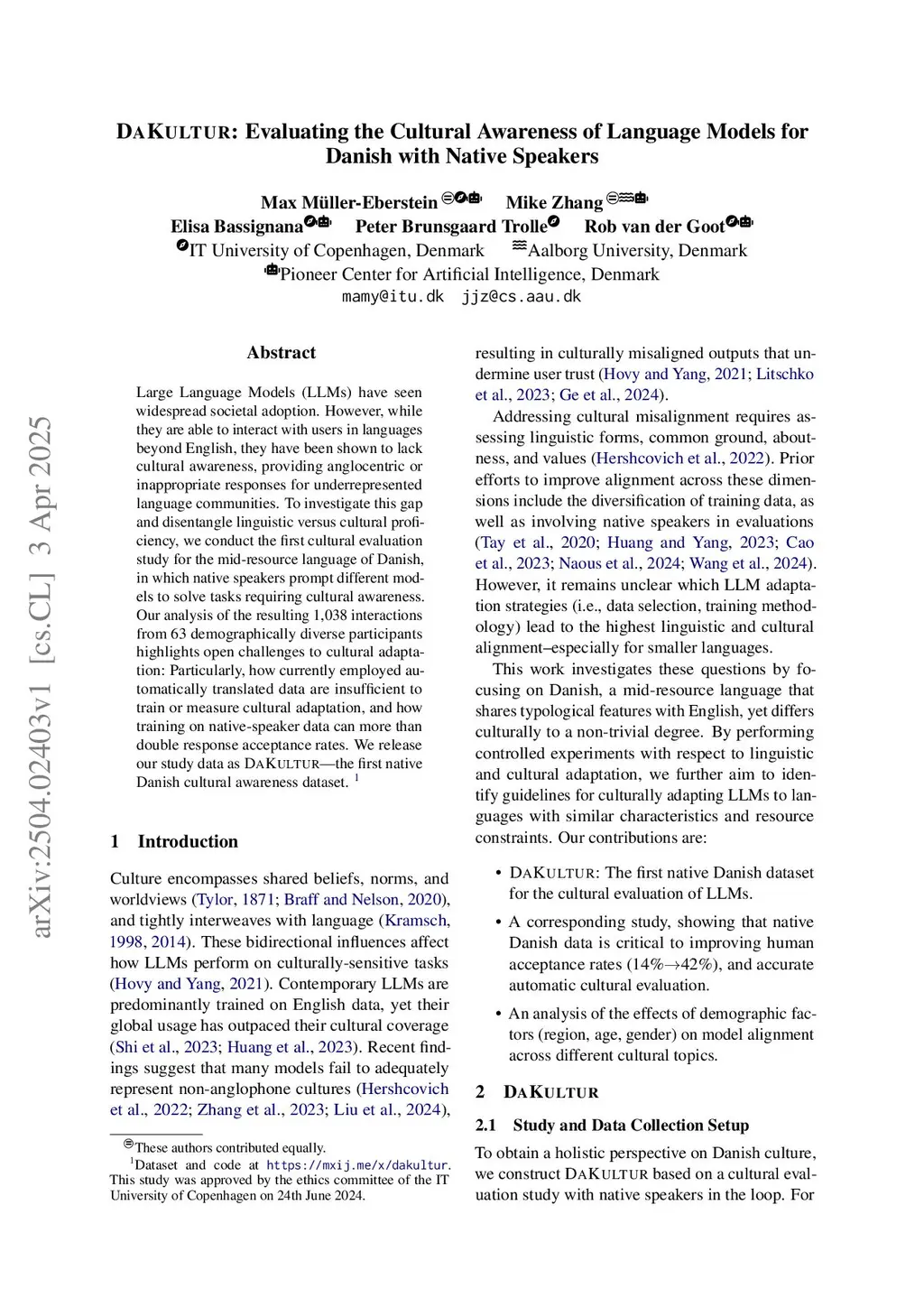 Large Language Models (LLMs) have seen widespread societal adoption. However, while they are able to interact with users in languages beyond English, they have been shown to lack cultural awareness, providing anglocentric or inappropriate responses for underrepresented language communities. To investigate this gap and disentangle linguistic versus cultural proficiency, we conduct the first cultural evaluation study for the mid-resource language of Danish, in which native speakers prompt different models to solve tasks requiring cultural awareness. Our analysis of the resulting 1,038 interactions from 63 demographically diverse participants highlights open challenges to cultural adaptation: Particularly, how currently employed automatically translated data are insufficient to train or measure cultural adaptation, and how training on native-speaker data can more than double response acceptance rates. We release our study data as DaKultur - the first native Danish cultural awareness dataset.