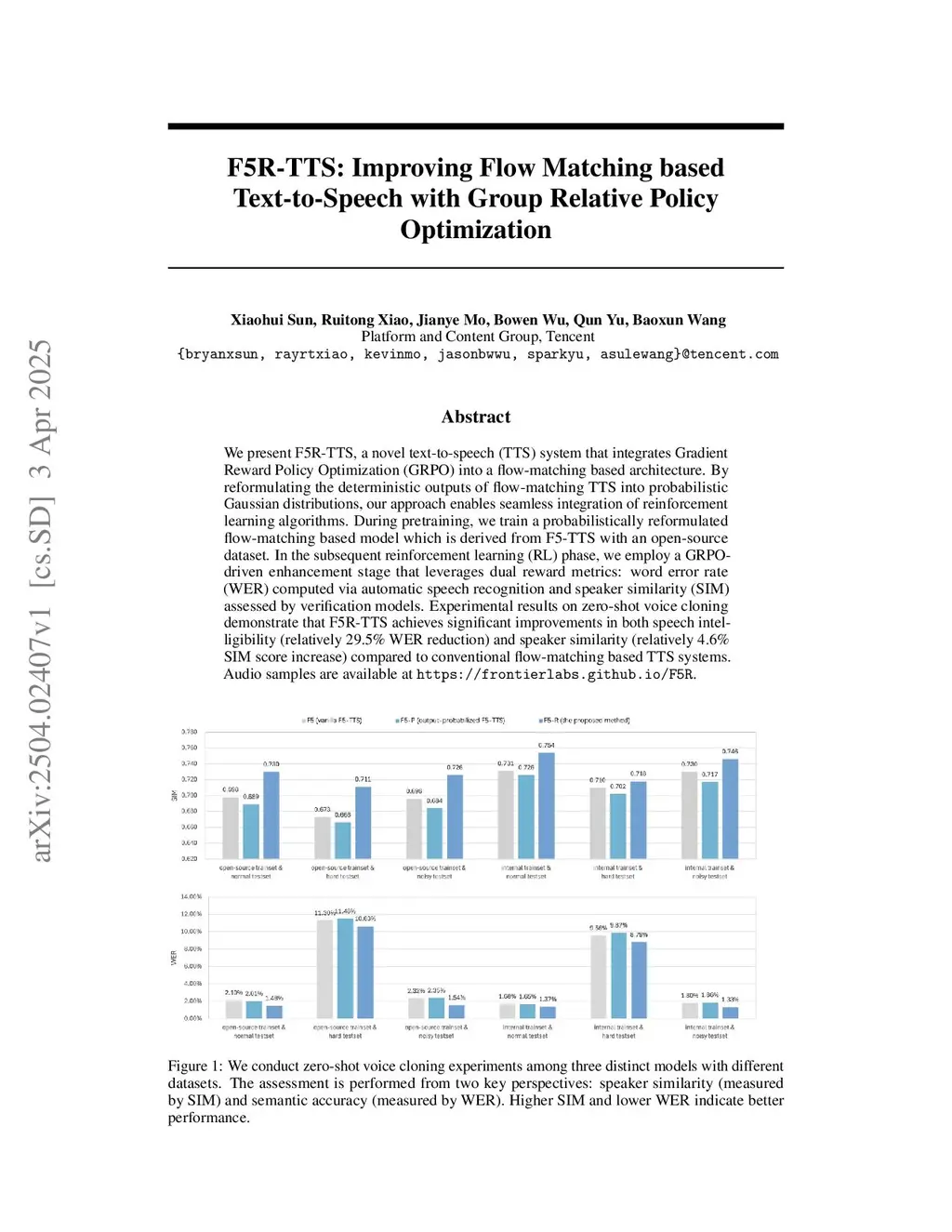 We present F5R-TTS, a novel text-to-speech (TTS) system that integrates Group Relative Policy Optimization (GRPO) into a flow-matching based architecture. By reformulating the deterministic outputs of flow-matching TTS into probabilistic Gaussian distributions, our approach enables seamless integration of reinforcement learning algorithms. During pretraining, we train a probabilistically reformulated flow-matching based model which is derived from F5-TTS with an open-source dataset. In the subsequent reinforcement learning (RL) phase, we employ a GRPO-driven enhancement stage that leverages dual reward metrics: word error rate (WER) computed via automatic speech recognition and speaker similarity (SIM) assessed by verification models. Experimental results on zero-shot voice cloning demonstrate that F5R-TTS achieves significant improvements in both speech intelligibility (a 29.5% relative reduction in WER) and speaker similarity (a 4.6% relative increase in SIM score) compared to conventional flow-matching based TTS systems. Audio samples are available atthis https URL.