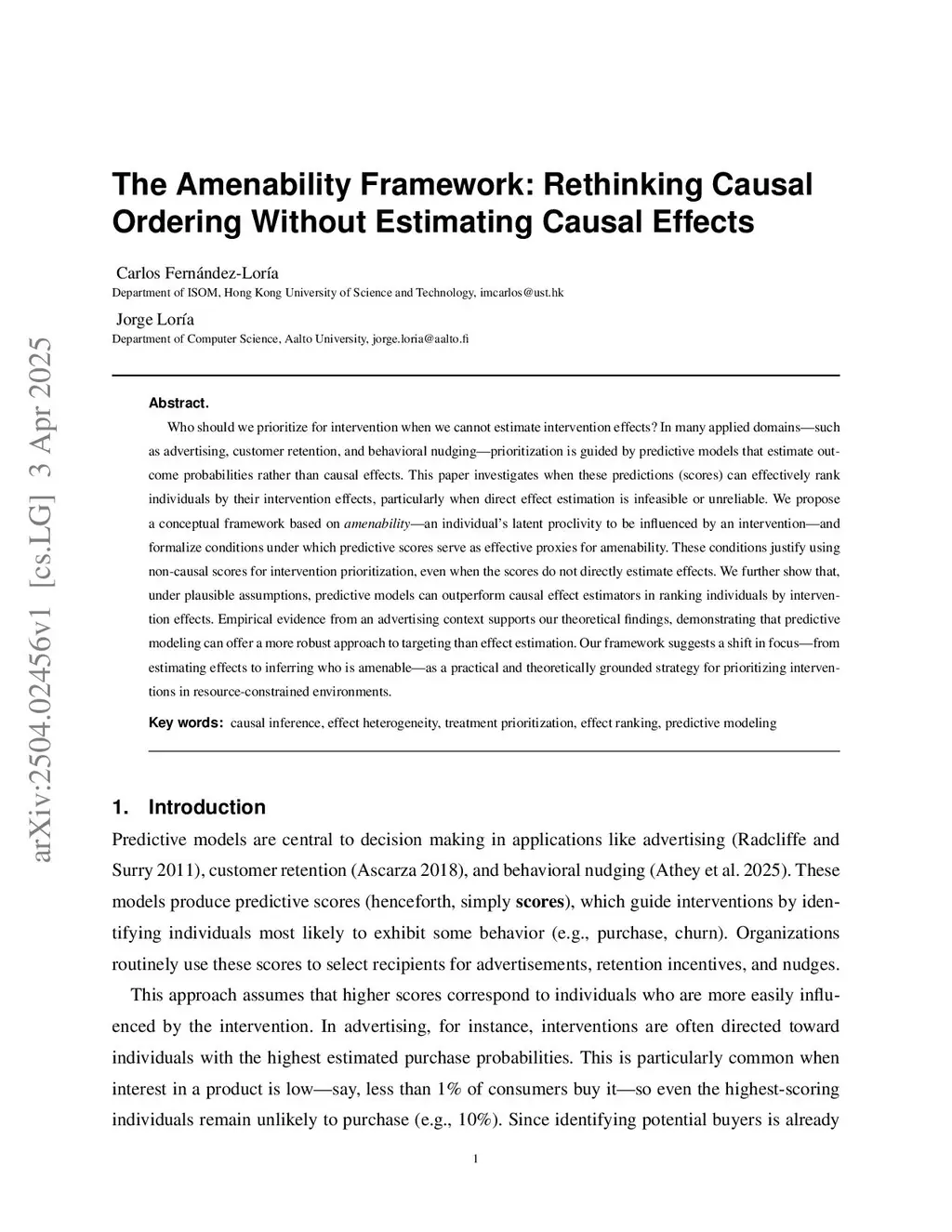 Who should we prioritize for intervention when we cannot estimate intervention effects? In many applied domains (e.g., advertising, customer retention, and behavioral nudging) prioritization is guided by predictive models that estimate outcome probabilities rather than causal effects. This paper investigates when these predictions (scores) can effectively rank individuals by their intervention effects, particularly when direct effect estimation is infeasible or unreliable. We propose a conceptual framework based on amenability: an individual's latent proclivity to be influenced by an intervention. We then formalize conditions under which predictive scores serve as effective proxies for amenability. These conditions justify using non-causal scores for intervention prioritization, even when the scores do not directly estimate effects. We further show that, under plausible assumptions, predictive models can outperform causal effect estimators in ranking individuals by intervention effects. Empirical evidence from an advertising context supports our theoretical findings, demonstrating that predictive modeling can offer a more robust approach to targeting than effect estimation. Our framework suggests a shift in focus, from estimating effects to inferring who is amenable, as a practical and theoretically grounded strategy for prioritizing interventions in resource-constrained environments.