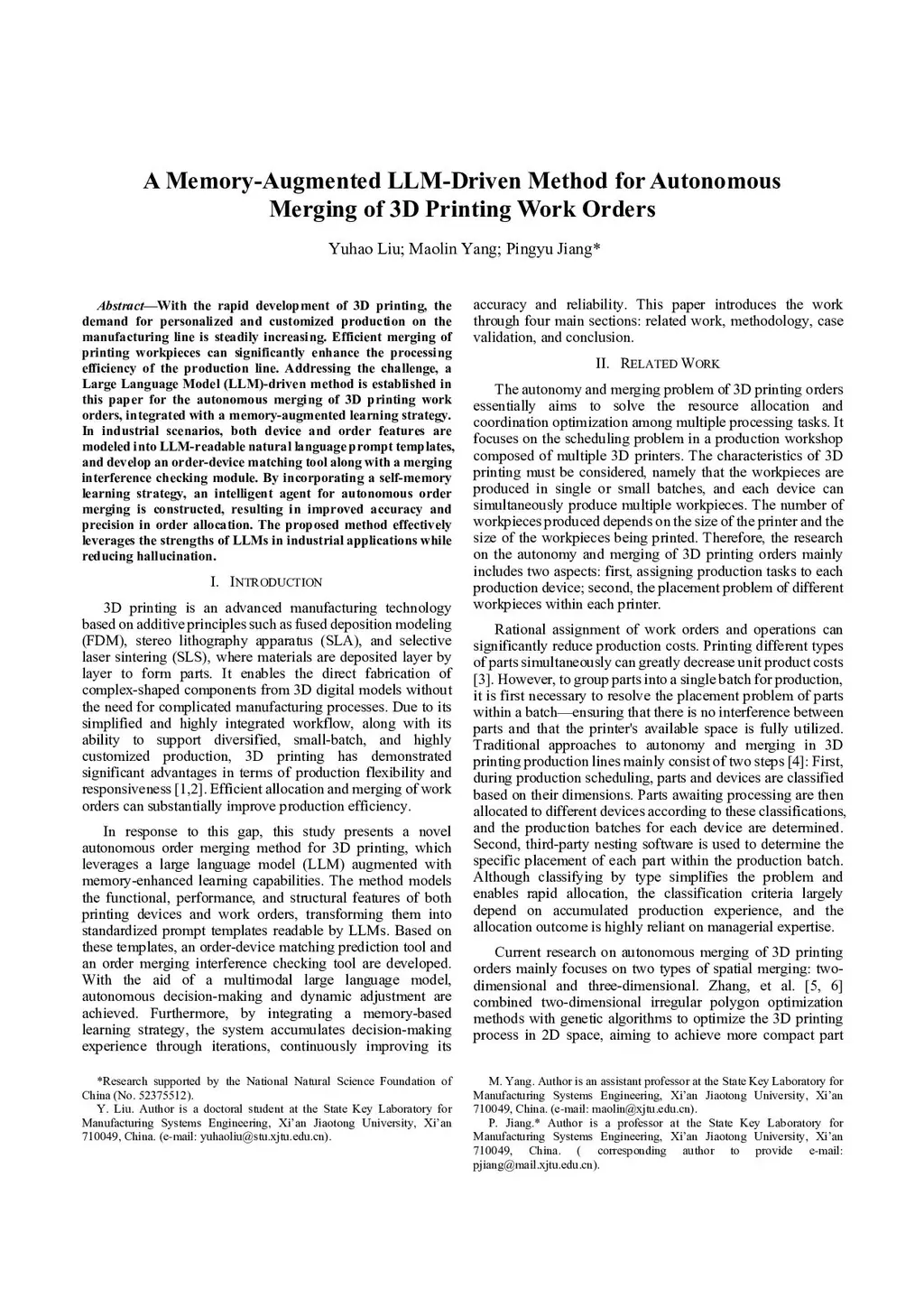 With the rapid development of 3D printing, the demand for personalized and customized production on the manufacturing line is steadily increasing. Efficient merging of printing workpieces can significantly enhance the processing efficiency of the production line. Addressing the challenge, a Large Language Model (LLM)-driven method is established in this paper for the autonomous merging of 3D printing work orders, integrated with a memory-augmented learning strategy. In industrial scenarios, both device and order features are modeled into LLM-readable natural language prompt templates, and develop an order-device matching tool along with a merging interference checking module. By incorporating a self-memory learning strategy, an intelligent agent for autonomous order merging is constructed, resulting in improved accuracy and precision in order allocation. The proposed method effectively leverages the strengths of LLMs in industrial applications while reducing hallucination.