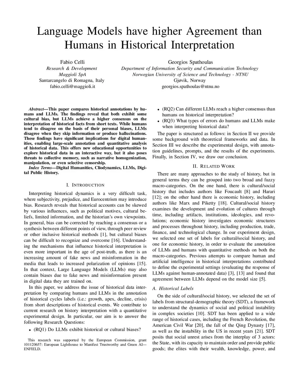 This paper compares historical annotations by humans and Large Language Models. The findings reveal that both exhibit some cultural bias, but Large Language Models achieve a higher consensus on the interpretation of historical facts from short texts. While humans tend to disagree on the basis of their personal biases, Large Models disagree when they skip information or produce hallucinations. These findings have significant implications for digital humanities, enabling large-scale annotation and quantitative analysis of historical data. This offers new educational and research opportunities to explore historical interpretations from different Language Models, fostering critical thinking about bias.