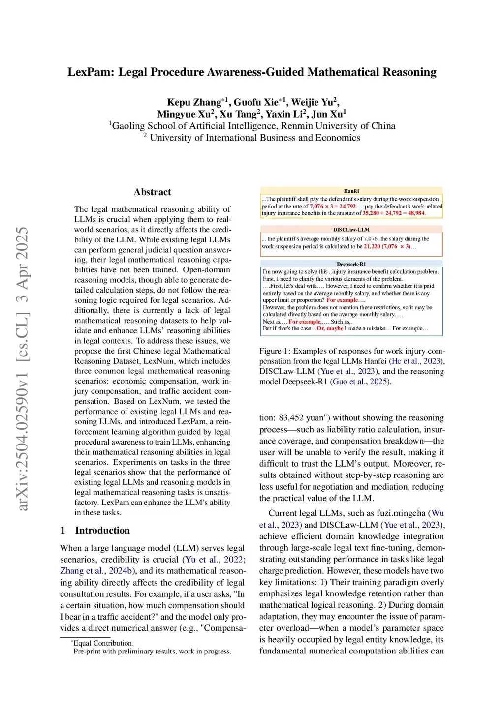 Legal mathematical reasoning is essential for applying large language models (LLMs) in high-stakes legal contexts, where outputs must be both mathematically accurate and procedurally compliant. However, existing legal LLMs lack structured numerical reasoning, and open-domain models, though capable of calculations, often overlook mandatory legal steps. To address this, we present LexNum, the first Chinese legal mathematical reasoning benchmark, covering three representative scenarios where each instance reflects legally grounded procedural flows. We further propose LexPam, a two-stage reinforcement learning framework for efficient legal reasoning training. Leveraging curriculum learning, we use a stronger teacher model to partition data into basic and challenging subsets. A lightweight 1.5B student model is then fine-tuned with Group Relative Policy Optimization, which avoids costly value networks and enables stable training from sparse, end-of-sequence rewards. The first stage improves accuracy and format; the second introduces a novel reward to guide procedural alignment via task-specific legal elements. Experiments show that existing models perform poorly on LexNum, while LexPam enhances both mathematical accuracy and legal coherence, and generalizes effectively across tasks and domains.