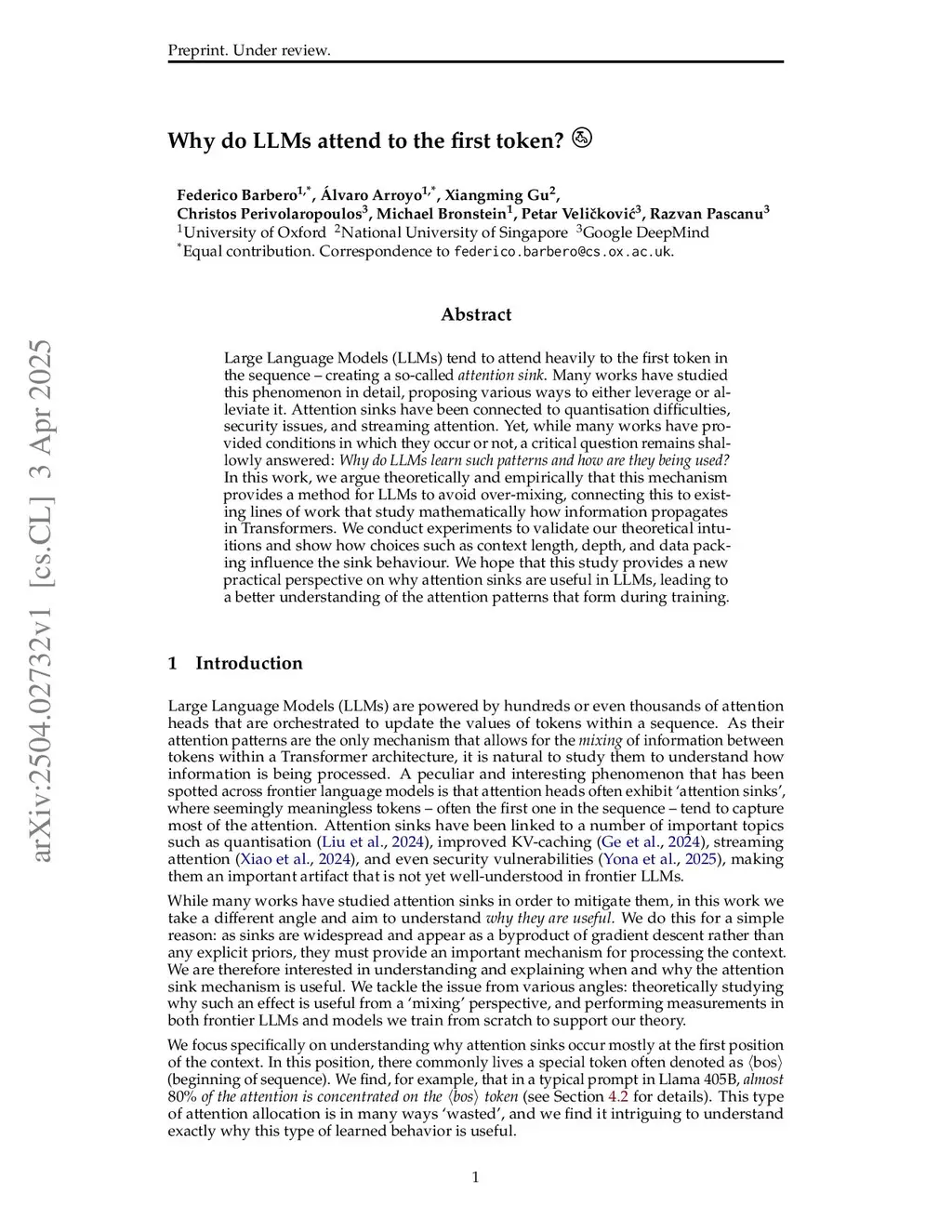 Large Language Models (LLMs) tend to attend heavily to the first token in the sequence -- creating a so-called attention sink. Many works have studied this phenomenon in detail, proposing various ways to either leverage or alleviate it. Attention sinks have been connected to quantisation difficulties, security issues, and streaming attention. Yet, while many works have provided conditions in which they occur or not, a critical question remains shallowly answered: Why do LLMs learn such patterns and how are they being used? In this work, we argue theoretically and empirically that this mechanism provides a method for LLMs to avoid over-mixing, connecting this to existing lines of work that study mathematically how information propagates in Transformers. We conduct experiments to validate our theoretical intuitions and show how choices such as context length, depth, and data packing influence the sink behaviour. We hope that this study provides a new practical perspective on why attention sinks are useful in LLMs, leading to a better understanding of the attention patterns that form during training.