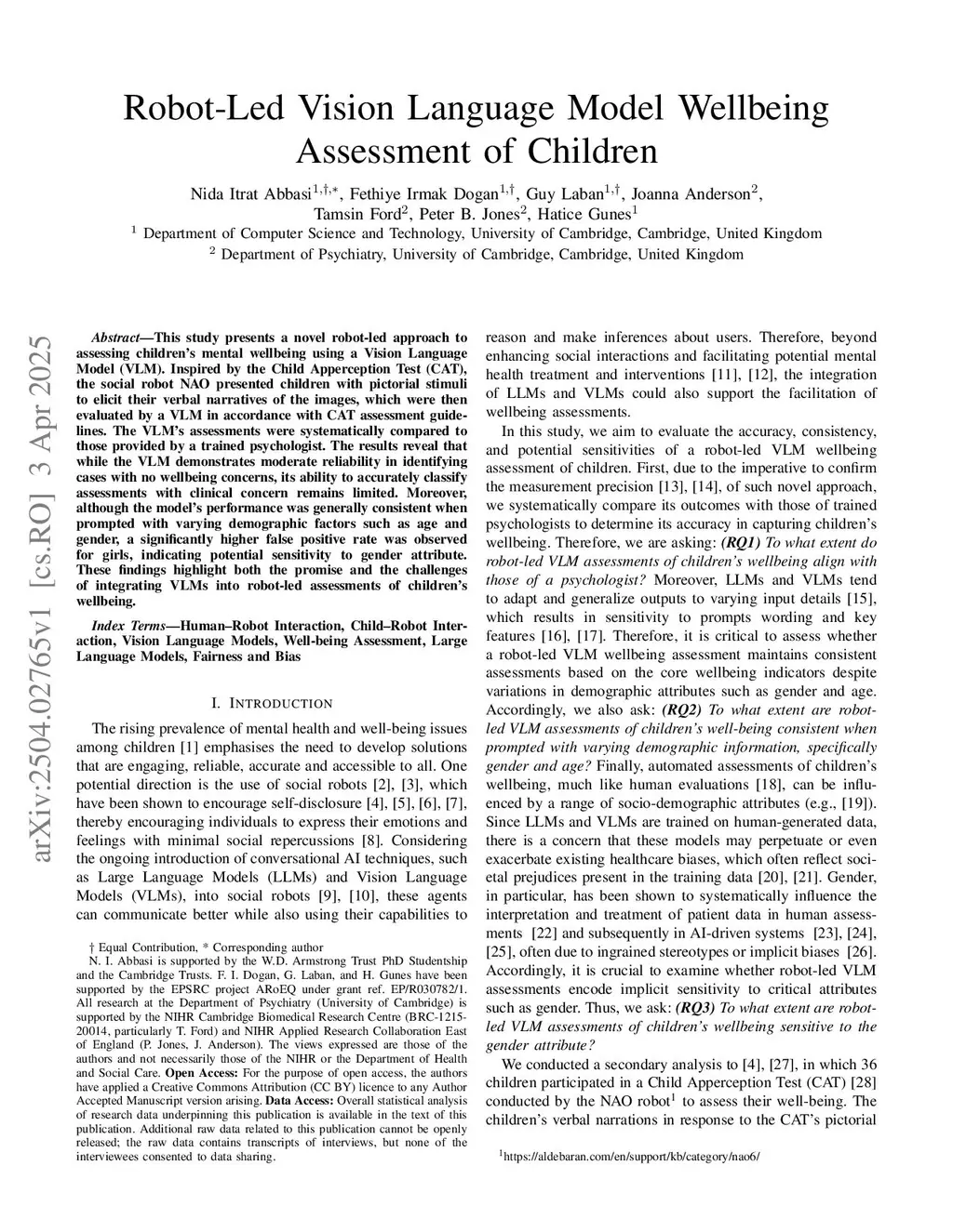 Robot-Led Vision Language Model Wellbeing Assessment of Children