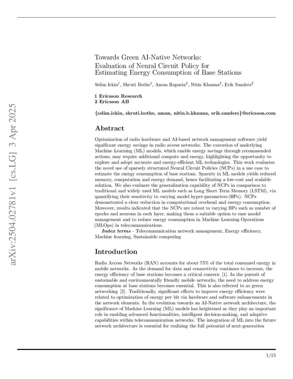 Optimization of radio hardware and AI-based network management software yield significant energy savings in radio access networks. The execution of underlying Machine Learning (ML) models, which enable energy savings through recommended actions, may require additional compute and energy, highlighting the opportunity to explore and adopt accurate and energy-efficient ML technologies. This work evaluates the novel use of sparsely structured Neural Circuit Policies (NCPs) in a use case to estimate the energy consumption of base stations. Sparsity in ML models yields reduced memory, computation and energy demand, hence facilitating a low-cost and scalable solution. We also evaluate the generalization capability of NCPs in comparison to traditional and widely used ML models such as Long Short Term Memory (LSTM), via quantifying their sensitivity to varying model hyper-parameters (HPs). NCPs demonstrated a clear reduction in computational overhead and energy consumption. Moreover, results indicated that the NCPs are robust to varying HPs such as number of epochs and neurons in each layer, making them a suitable option to ease model management and to reduce energy consumption in Machine Learning Operations (MLOps) in telecommunications.