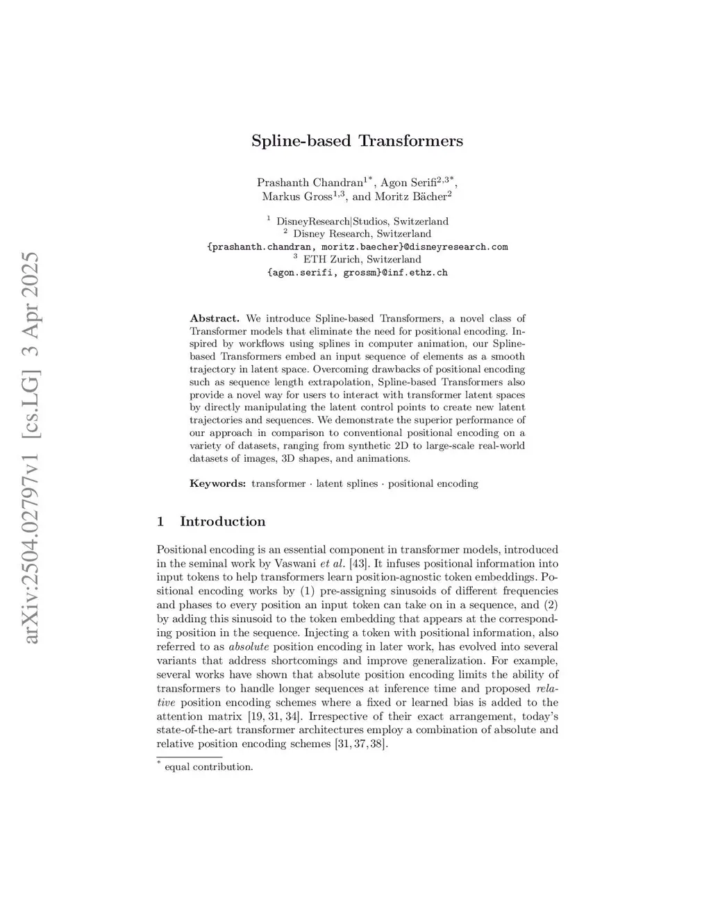 We introduce Spline-based Transformers, a novel class of Transformer models that eliminate the need for positional encoding. Inspired by workflows using splines in computer animation, our Spline-based Transformers embed an input sequence of elements as a smooth trajectory in latent space. Overcoming drawbacks of positional encoding such as sequence length extrapolation, Spline-based Transformers also provide a novel way for users to interact with transformer latent spaces by directly manipulating the latent control points to create new latent trajectories and sequences. We demonstrate the superior performance of our approach in comparison to conventional positional encoding on a variety of datasets, ranging from synthetic 2D to large-scale real-world datasets of images, 3D shapes, and animations.