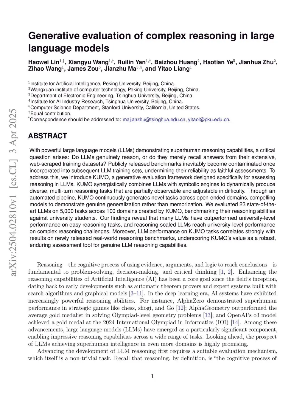 With powerful large language models (LLMs) demonstrating superhuman reasoning capabilities, a critical question arises: Do LLMs genuinely reason, or do they merely recall answers from their extensive, web-scraped training datasets? Publicly released benchmarks inevitably become contaminated once incorporated into subsequent LLM training sets, undermining their reliability as faithful assessments. To address this, we introduce KUMO, a generative evaluation framework designed specifically for assessing reasoning in LLMs. KUMO synergistically combines LLMs with symbolic engines to dynamically produce diverse, multi-turn reasoning tasks that are partially observable and adjustable in difficulty. Through an automated pipeline, KUMO continuously generates novel tasks across open-ended domains, compelling models to demonstrate genuine generalization rather than memorization. We evaluated 23 state-of-the-art LLMs on 5,000 tasks across 100 domains created by KUMO, benchmarking their reasoning abilities against university students. Our findings reveal that many LLMs have outperformed university-level performance on easy reasoning tasks, and reasoning-scaled LLMs reach university-level performance on complex reasoning challenges. Moreover, LLM performance on KUMO tasks correlates strongly with results on newly released real-world reasoning benchmarks, underscoring KUMO's value as a robust, enduring assessment tool for genuine LLM reasoning capabilities.