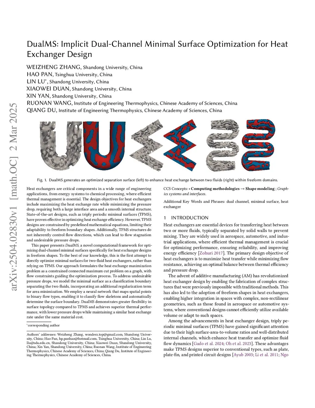 Heat exchangers are critical components in a wide range of engineering applications, from energy systems to chemical processing, where efficient thermal management is essential. The design objectives for heat exchangers include maximizing the heat exchange rate while minimizing the pressure drop, requiring both a large interface area and a smooth internal structure. State-of-the-art designs, such as triply periodic minimal surfaces (TPMS), have proven effective in optimizing heat exchange efficiency. However, TPMS designs are constrained by predefined mathematical equations, limiting their adaptability to freeform boundary shapes. Additionally, TPMS structures do not inherently control flow directions, which can lead to flow stagnation and undesirable pressure drops.This paper presents DualMS, a novel computational framework for optimizing dual-channel minimal surfaces specifically for heat exchanger designs in freeform shapes. To the best of our knowledge, this is the first attempt to directly optimize minimal surfaces for two-fluid heat exchangers, rather than relying on TPMS. Our approach formulates the heat exchange maximization problem as a constrained connected maximum cut problem on a graph, with flow constraints guiding the optimization process. To address undesirable pressure drops, we model the minimal surface as a classification boundary separating the two fluids, incorporating an additional regularization term for area minimization. We employ a neural network that maps spatial points to binary flow types, enabling it to classify flow skeletons and automatically determine the surface boundary. DualMS demonstrates greater flexibility in surface topology compared to TPMS and achieves superior thermal performance, with lower pressure drops while maintaining a similar heat exchange rate under the same material cost.
