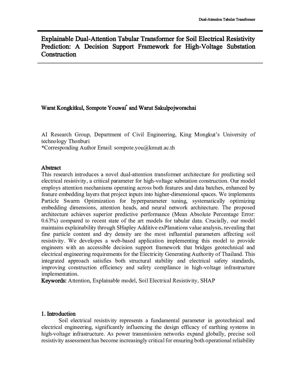 This research introduces a novel dual-attention transformer architecture for predicting soil electrical resistivity, a critical parameter for high-voltage substation construction. Our model employs attention mechanisms operating across both features and data batches, enhanced by feature embedding layers that project inputs into higher-dimensional spaces. We implements Particle Swarm Optimization for hyperparameter tuning, systematically optimizing embedding dimensions, attention heads, and neural network architecture. The proposed architecture achieves superior predictive performance (Mean Absolute Percentage Error: 0.63%) compared to recent state of the art models for tabular data. Crucially, our model maintains explainability through SHapley Additive exPlanations value analysis, revealing that fine particle content and dry density are the most influential parameters affecting soil resistivity. We developes a web-based application implementing this model to provide engineers with an accessible decision support framework that bridges geotechnical and electrical engineering requirements for the Electricity Generating Authority of Thailand. This integrated approach satisfies both structural stability and electrical safety standards, improving construction efficiency and safety compliance in high-voltage infrastructure implementation.