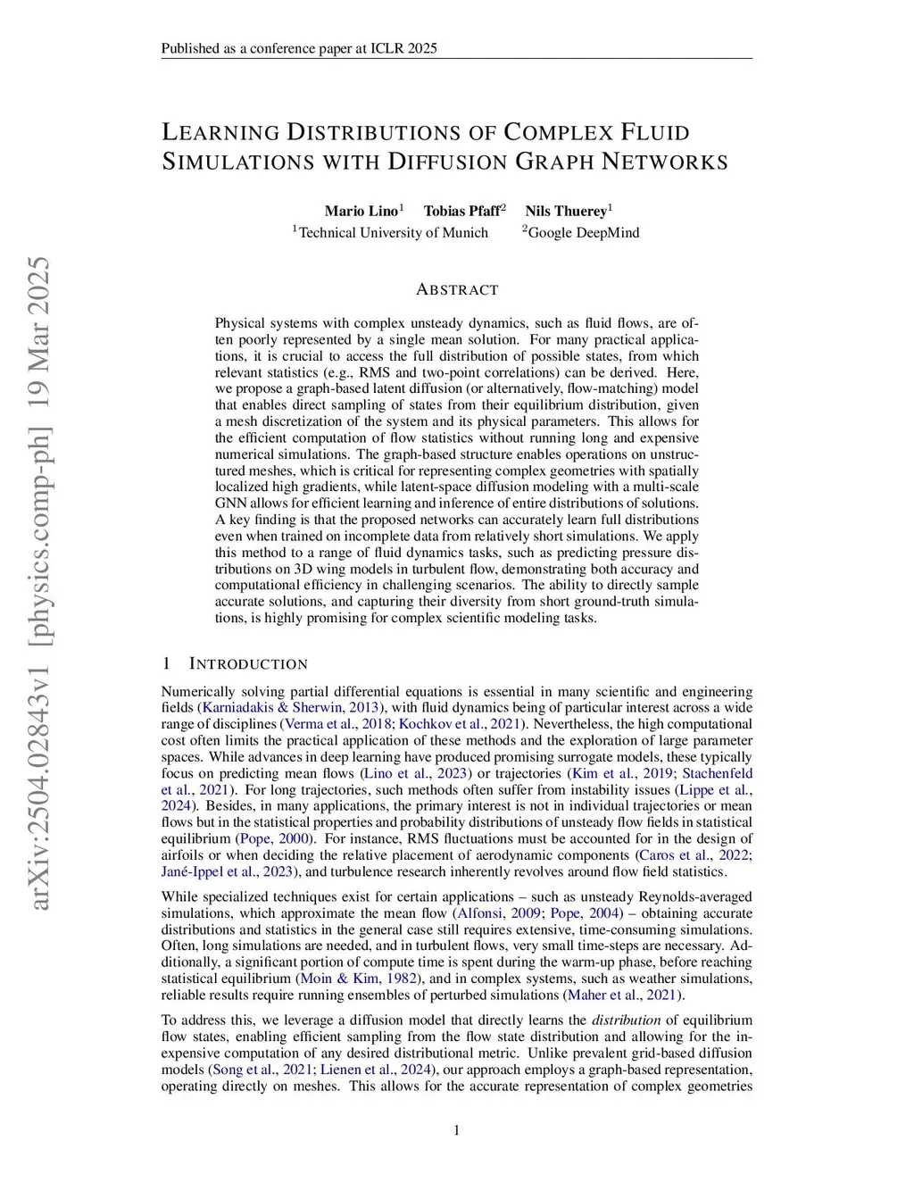 Physical systems with complex unsteady dynamics, such as fluid flows, are often poorly represented by a single mean solution. For many practical applications, it is crucial to access the full distribution of possible states, from which relevant statistics (e.g., RMS and two-point correlations) can be derived. Here, we propose a graph-based latent diffusion (or alternatively, flow-matching) model that enables direct sampling of states from their equilibrium distribution, given a mesh discretization of the system and its physical parameters. This allows for the efficient computation of flow statistics without running long and expensive numerical simulations. The graph-based structure enables operations on unstructured meshes, which is critical for representing complex geometries with spatially localized high gradients, while latent-space diffusion modeling with a multi-scale GNN allows for efficient learning and inference of entire distributions of solutions. A key finding is that the proposed networks can accurately learn full distributions even when trained on incomplete data from relatively short simulations. We apply this method to a range of fluid dynamics tasks, such as predicting pressure distributions on 3D wing models in turbulent flow, demonstrating both accuracy and computational efficiency in challenging scenarios. The ability to directly sample accurate solutions, and capturing their diversity from short ground-truth simulations, is highly promising for complex scientific modeling tasks.