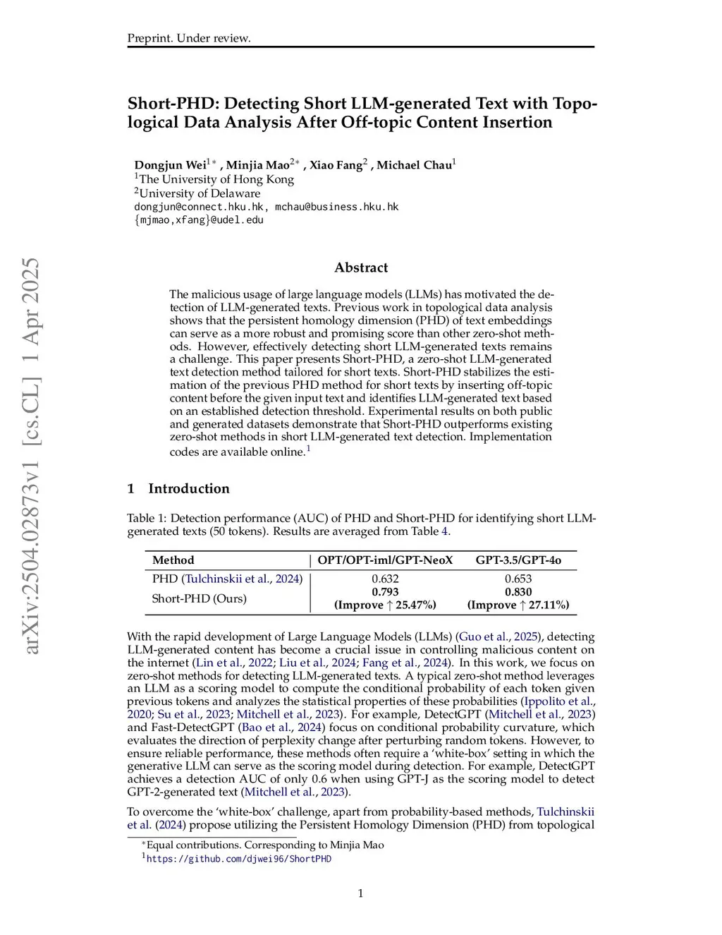 Short-PHD: Detecting Short LLM-generated Text with Topological Data Analysis After Off-topic Content Insertion