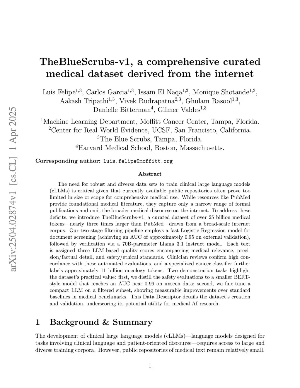 The need for robust and diverse data sets to train clinical large language models (cLLMs) is critical given that currently available public repositories often prove too limited in size or scope for comprehensive medical use. While resources like PubMed provide foundational medical literature, they capture only a narrow range of formal publications and omit the broader medical discourse on the internet. To address these deficits, we introduce TheBlueScrubs-v1, a curated dataset of over 25 billion medical tokens - nearly three times larger than PubMed - drawn from a broad-scale internet corpus. Our two-stage filtering pipeline employs a Logistic Regression model for document screening (achieving an AUC of approximately 0.95 on external validation), followed by verification via a 70B-parameter Llama 3.1 instruct model. Each text is assigned three LLM-based quality scores encompassing medical relevance, precision and factual detail, and safety and ethical standards. Clinician reviews confirm high concordance with these automated evaluations, and a specialized cancer classifier further labels approximately 11 billion oncology tokens. Two demonstration tasks highlight the dataset's practical value: first, we distill the safety evaluations to a smaller BERT-style model that reaches an AUC near 0.96 on unseen data; second, we fine-tune a compact LLM on a filtered subset, showing measurable improvements over standard baselines in medical benchmarks as well as private ones. This Data Descriptor details the dataset's creation and validation, underscoring its potential utility for medical AI research.