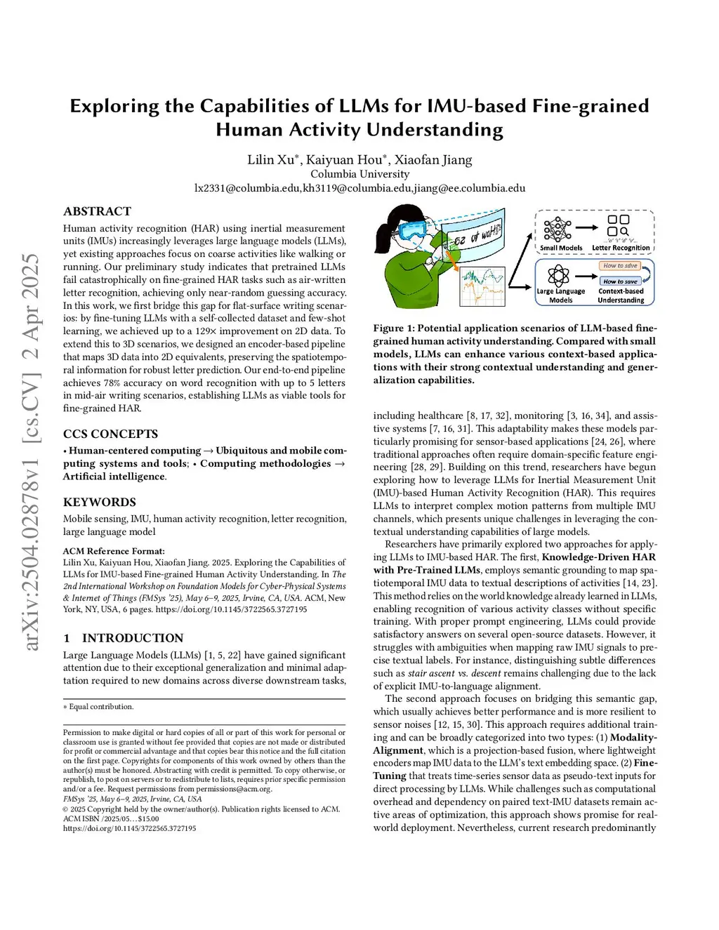 Human activity recognition (HAR) using inertial measurement units (IMUs) increasingly leverages large language models (LLMs), yet existing approaches focus on coarse activities like walking or running. Our preliminary study indicates that pretrained LLMs fail catastrophically on fine-grained HAR tasks such as air-written letter recognition, achieving only near-random guessing accuracy. In this work, we first bridge this gap for flat-surface writing scenarios: by fine-tuning LLMs with a self-collected dataset and few-shot learning, we achieved up to a 129x improvement on 2D data. To extend this to 3D scenarios, we designed an encoder-based pipeline that maps 3D data into 2D equivalents, preserving the spatiotemporal information for robust letter prediction. Our end-to-end pipeline achieves 78% accuracy on word recognition with up to 5 letters in mid-air writing scenarios, establishing LLMs as viable tools for fine-grained HAR.